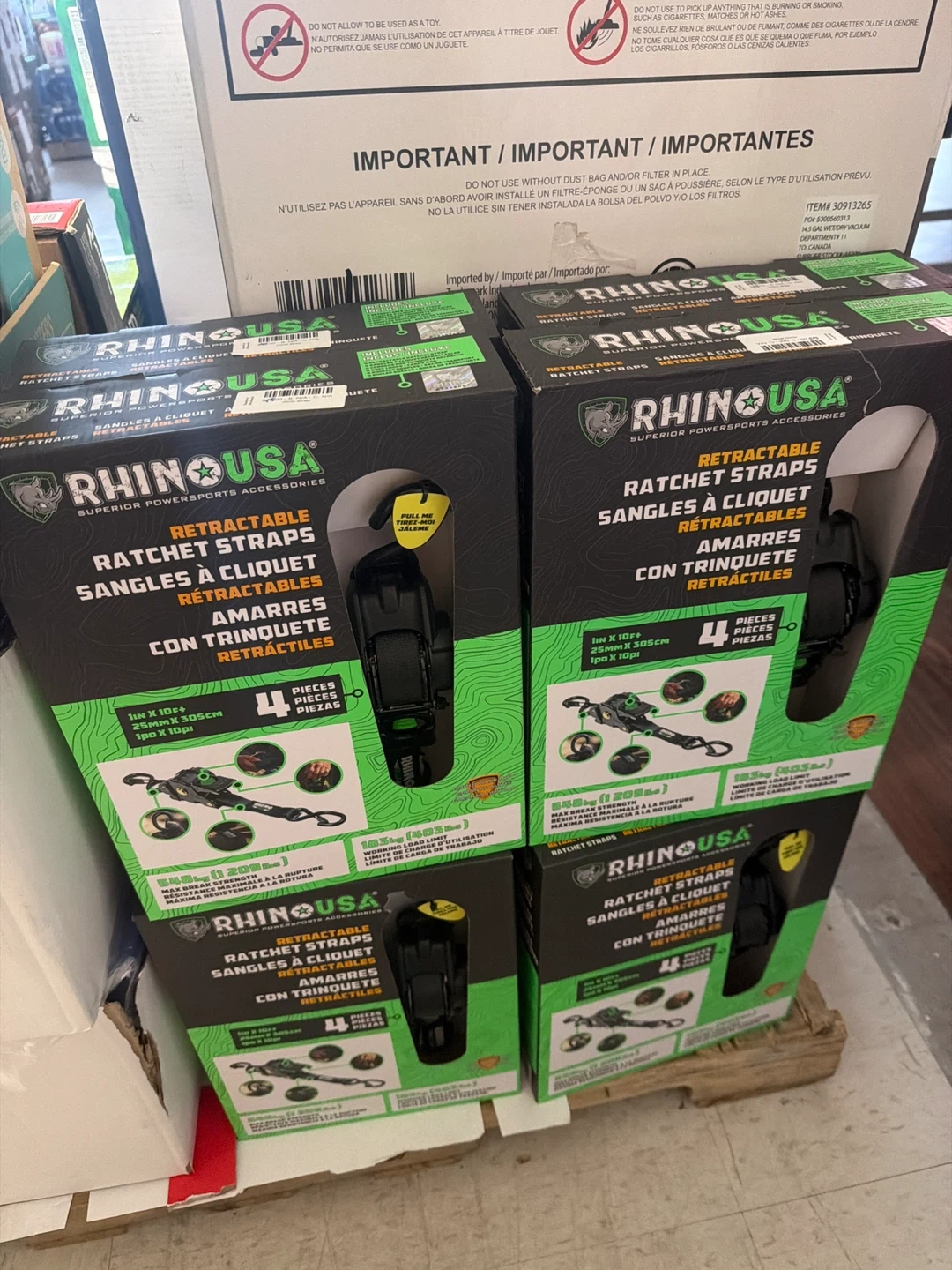 These Rhino USA retractable ratchet straps are for superior powersports accessories. Each strap measures 10ft x 1in (305cm x 25mm) and comes with 4 pieces per pack. They offer a 1200 lb. working load limit and a 3600 lb. break strength.