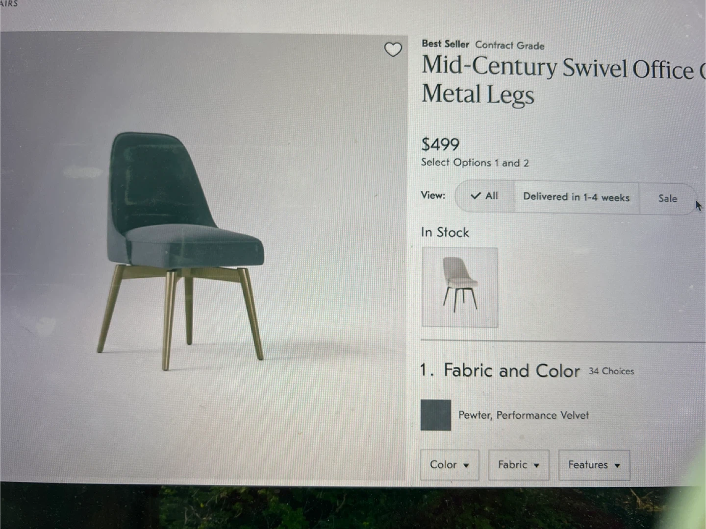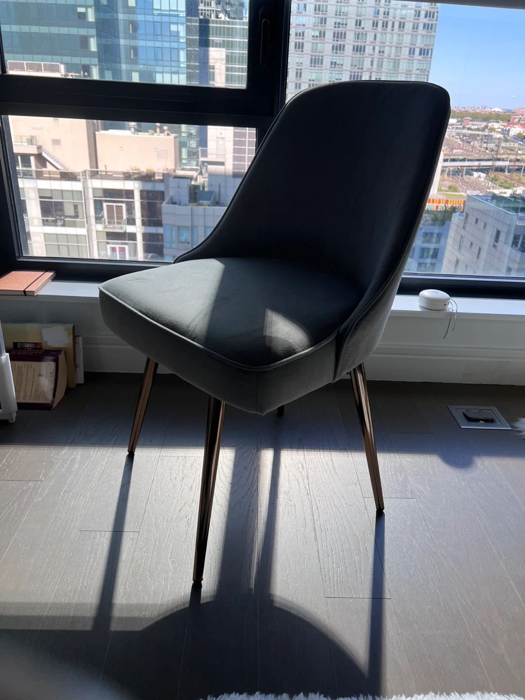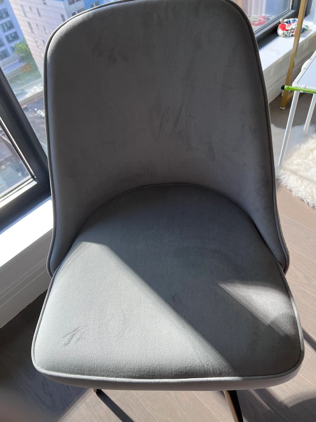 Selling a mid-century swivel office chair in pewter performance velvet! It has metal legs and is in great condition.