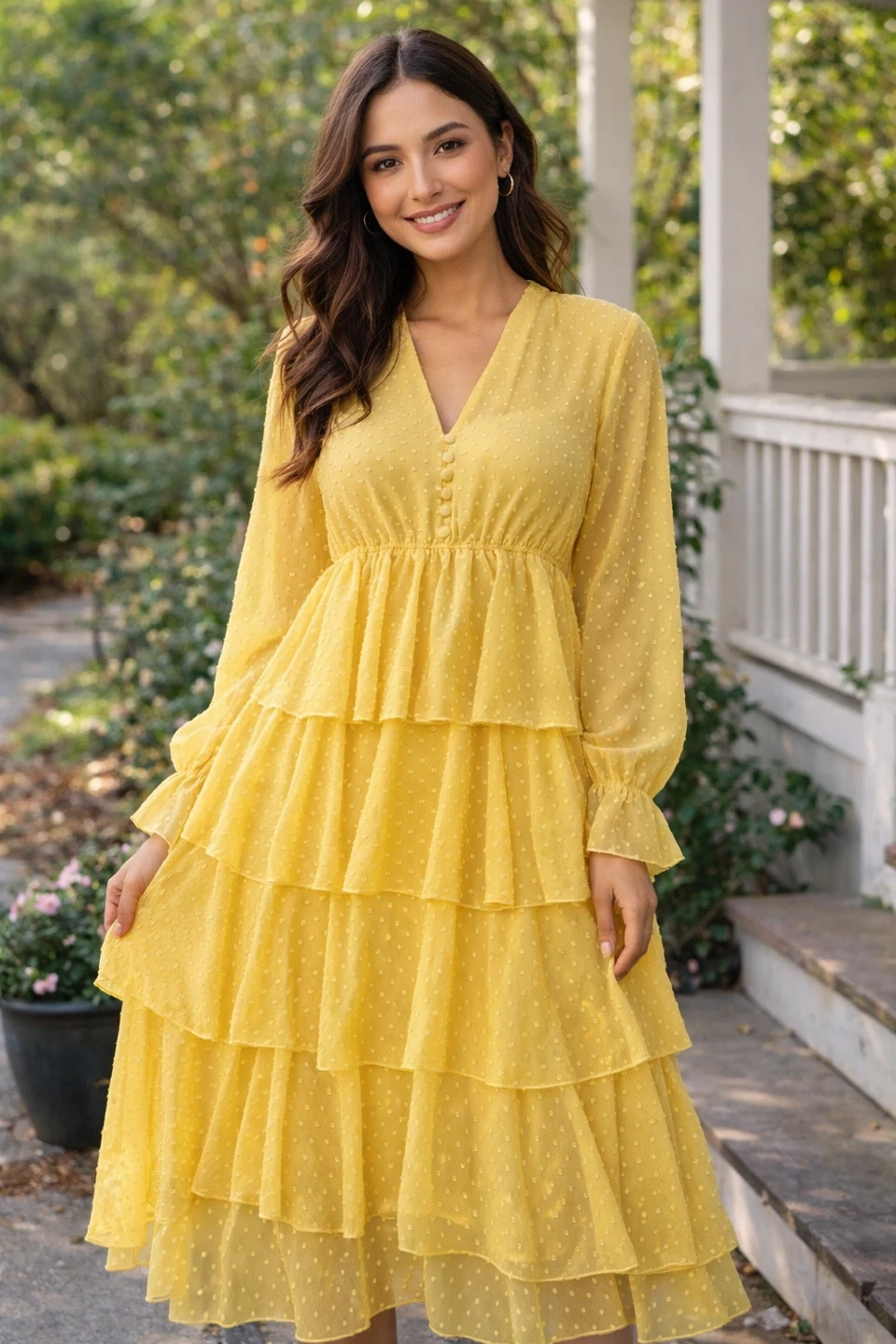 A lovely yellow chiffon dress with a tiered ruffle skirt and a polka dot pattern. It features a V-neck and long balloon sleeves with button cuffs. This dress would be perfect for a summer gathering or a special occasion!