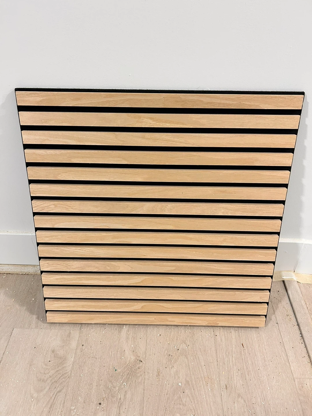 This wood slat panel features a natural wood finish with black backing. It's a decorative and acoustic element for any room. Wooden slats with black felt backing.