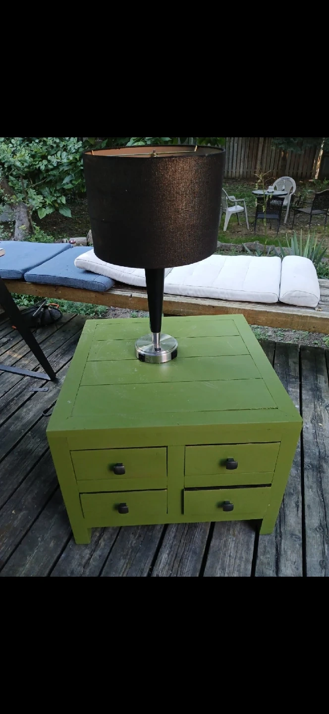 I have a green side table with a lamp for sale. It has four drawers and the lamp has a black shade. Great for a living room or bedroom!
