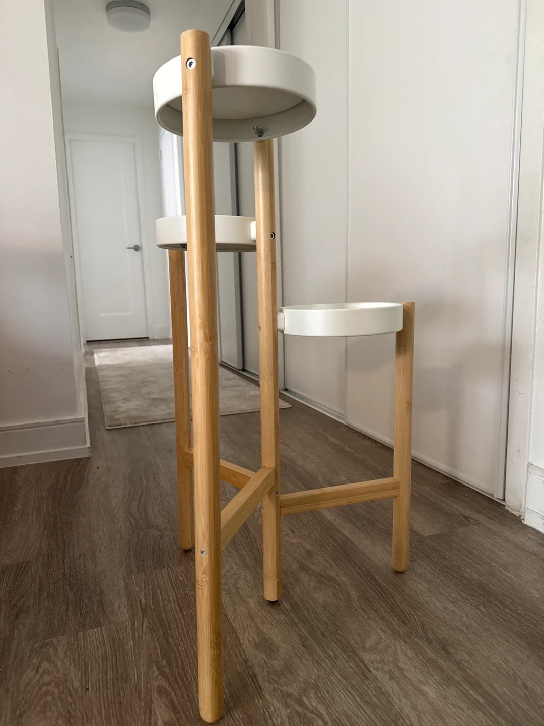 This plant stand has a natural bamboo frame with three white circular shelves. It's perfect for displaying potted plants indoors or on a covered patio. Bamboo and metal construction.
