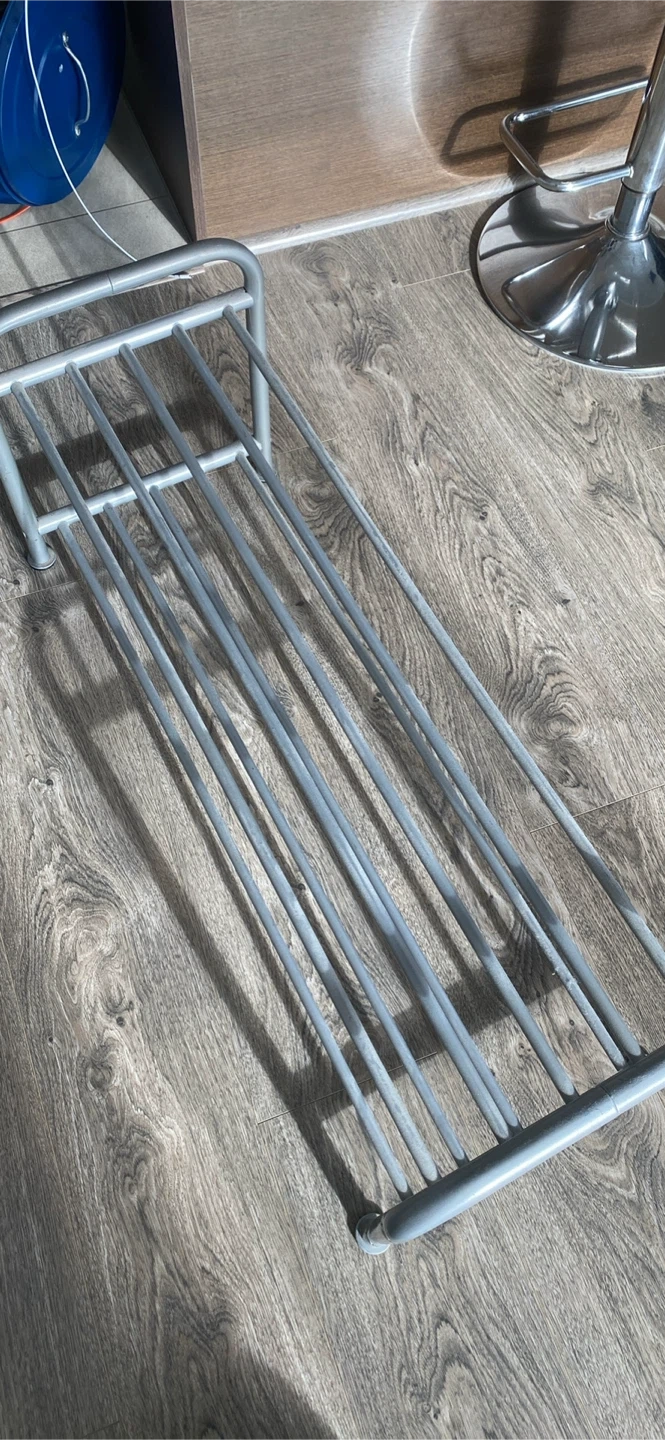 A simple grey metal shoe rack with multiple tiers. It's made of metal and is a handy way to keep footwear organized. This rack is great for entryways or closets.