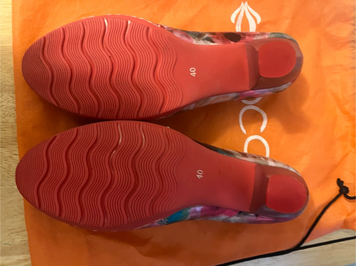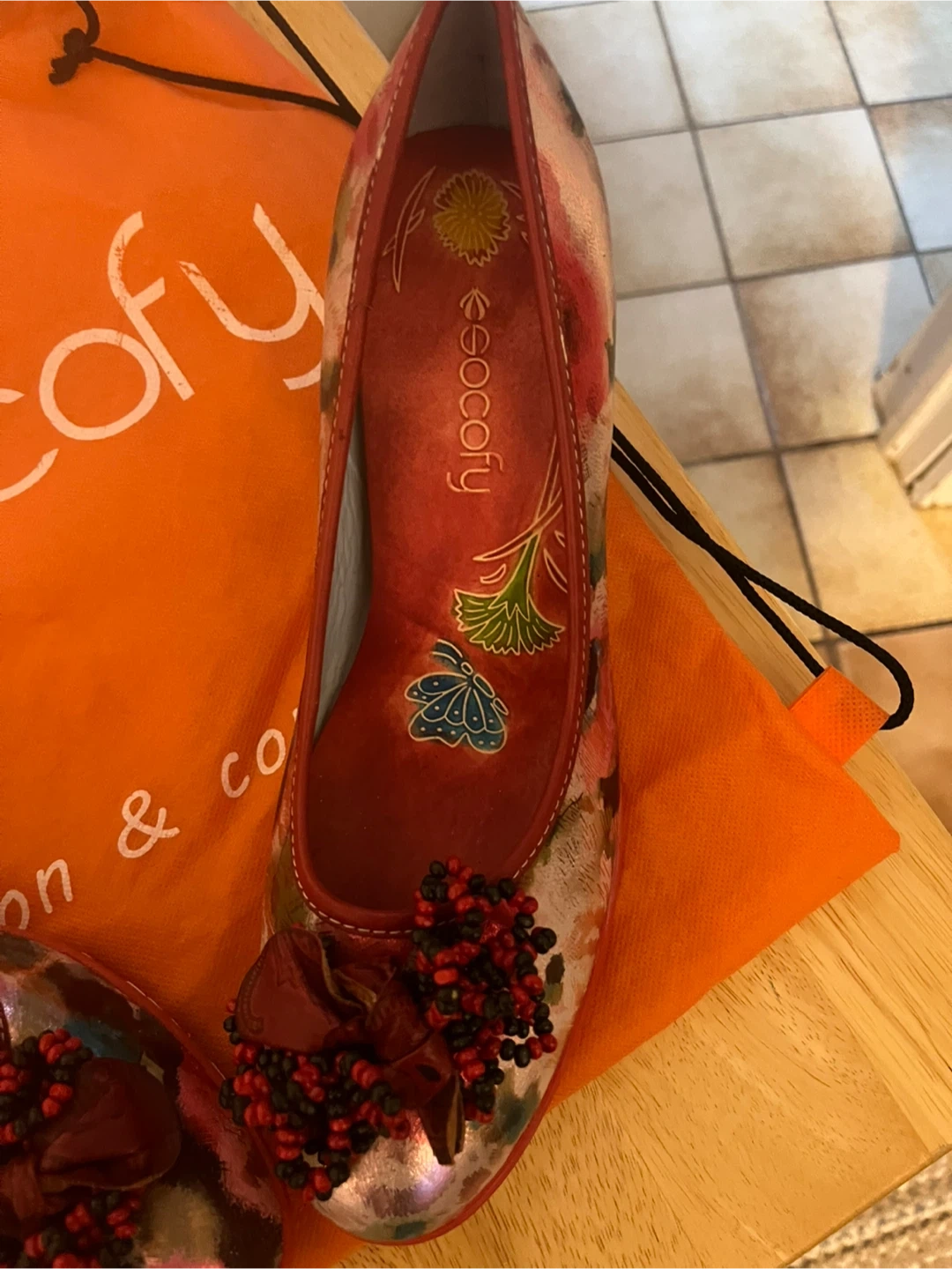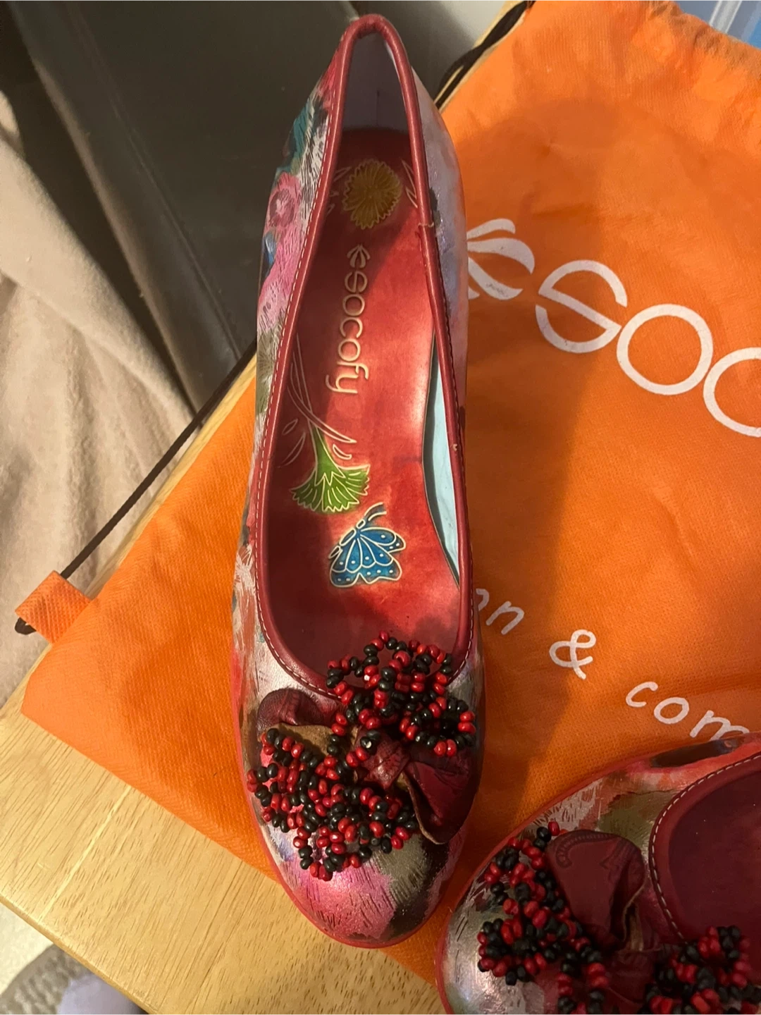 These Socofy heels feature a vibrant floral print with beaded embellishments. The shoes are size 40. Comes with a drawstring storage bag.