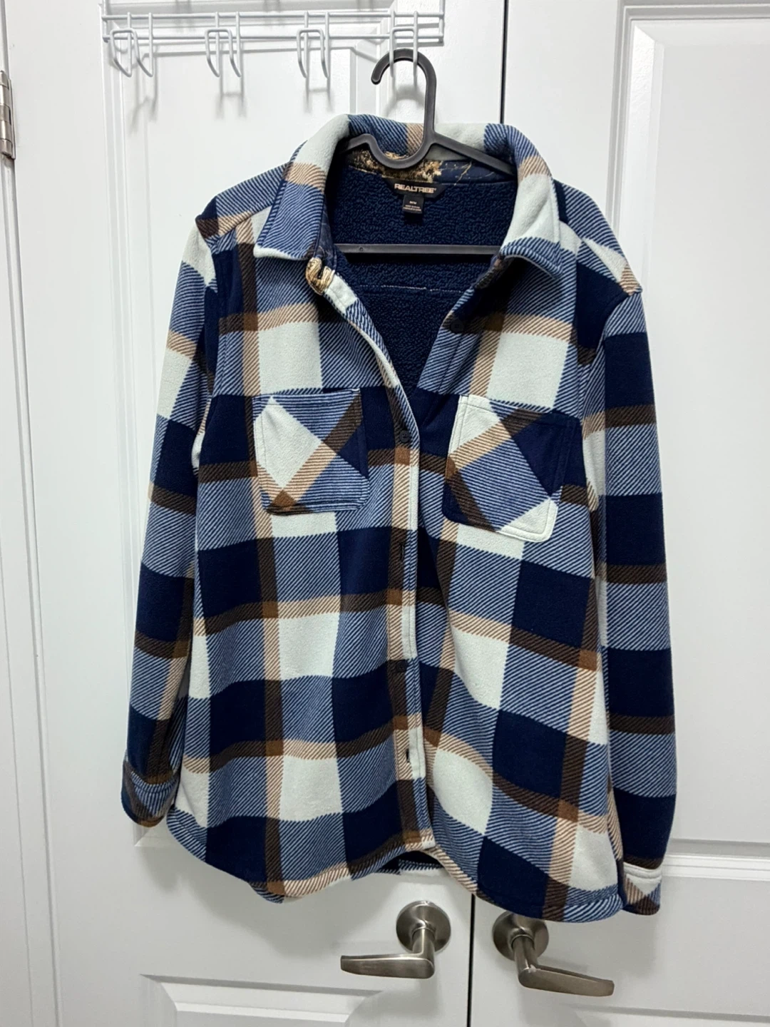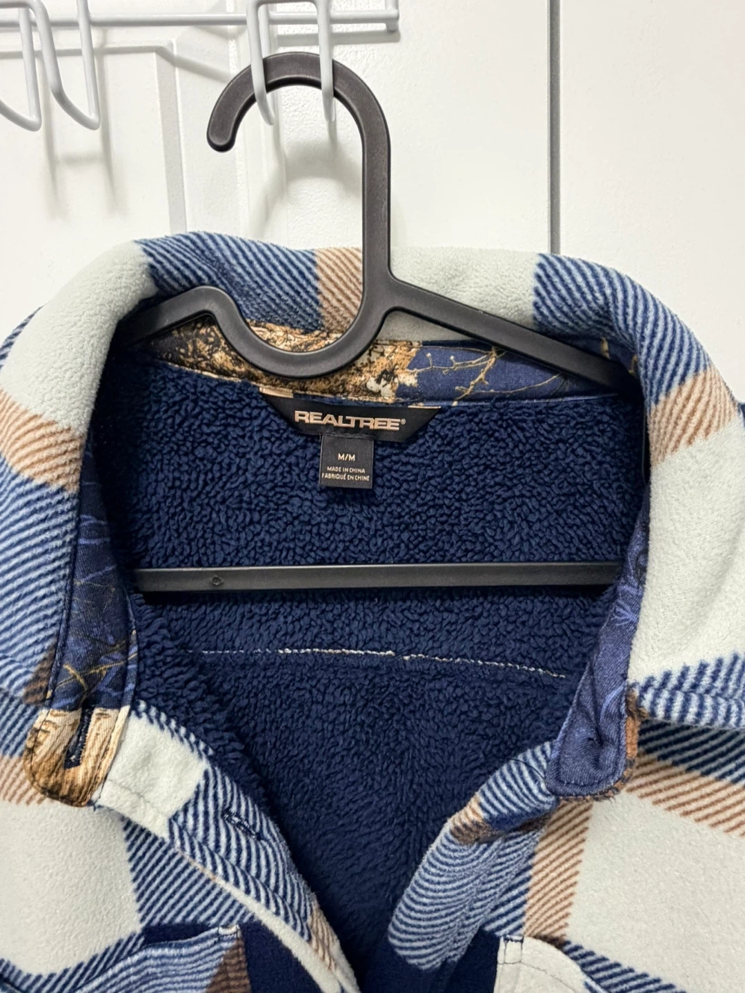 This Realtree shirt jacket is lined with cozy sherpa for extra warmth. It features a classic plaid pattern and two chest pockets. A great option for staying comfortable outdoors!