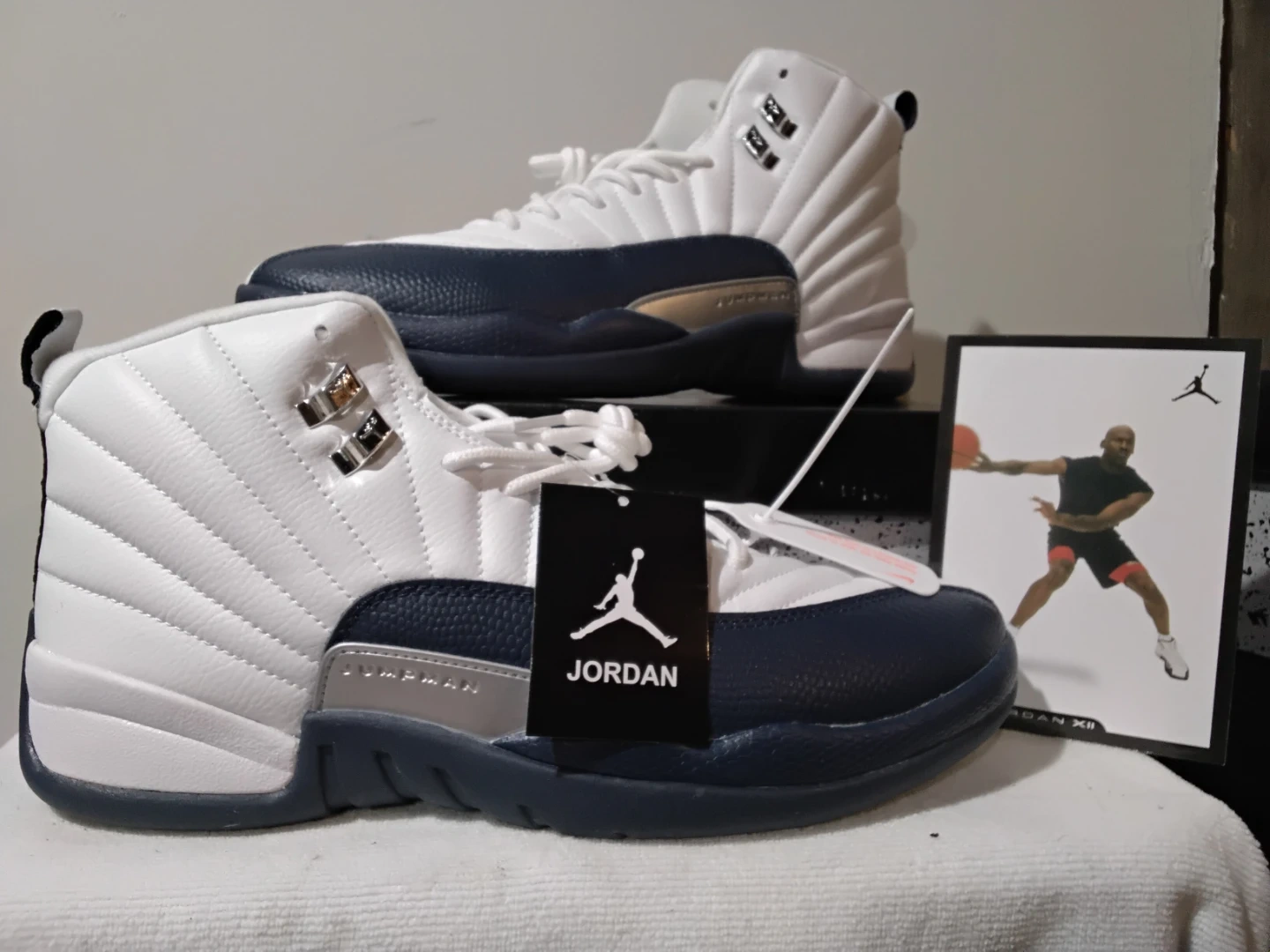 These Air Jordan 12s come in a classic white and navy colorway. The leather upper features the iconic stitched detailing. The contrasting navy mudguard and accents provide a sharp look. A metallic silver detail is also present on the side.