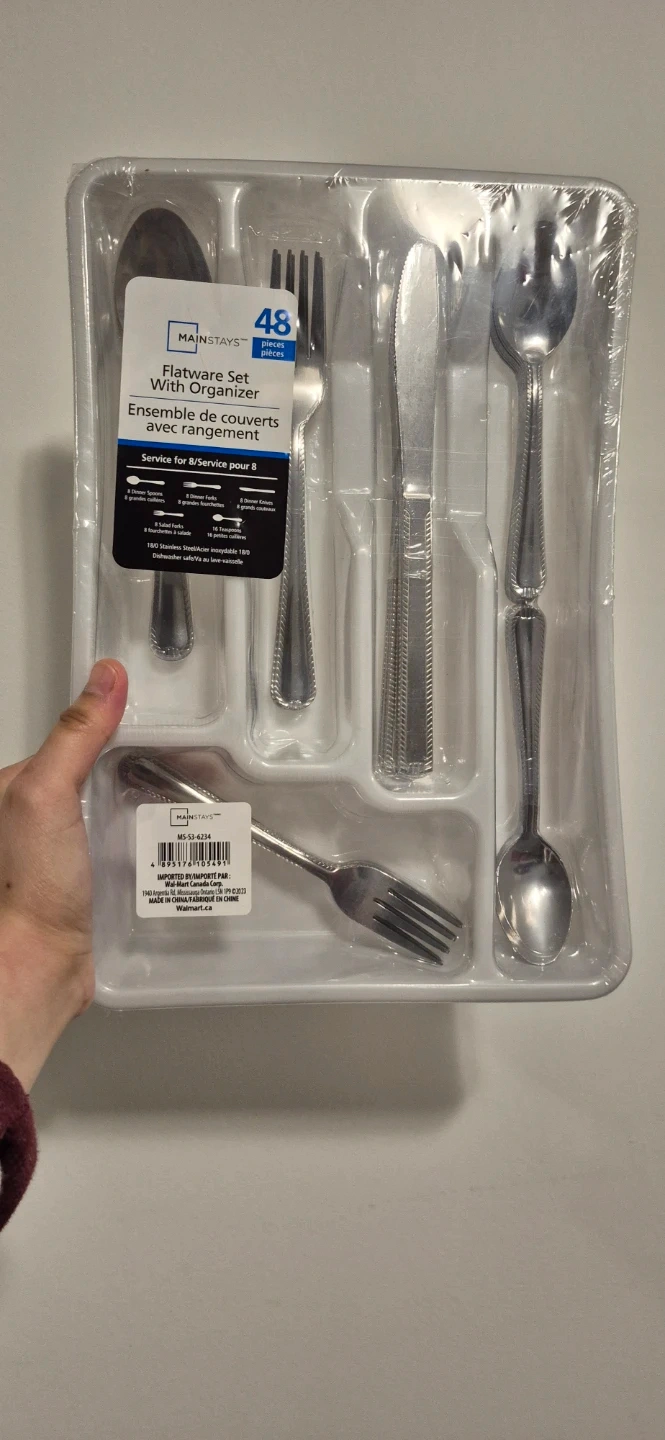 Mainstays flatware set includes 48 pieces, serving 8 people. It's made of 18/0 stainless steel and comes with a handy organizer. Dishwasher safe!