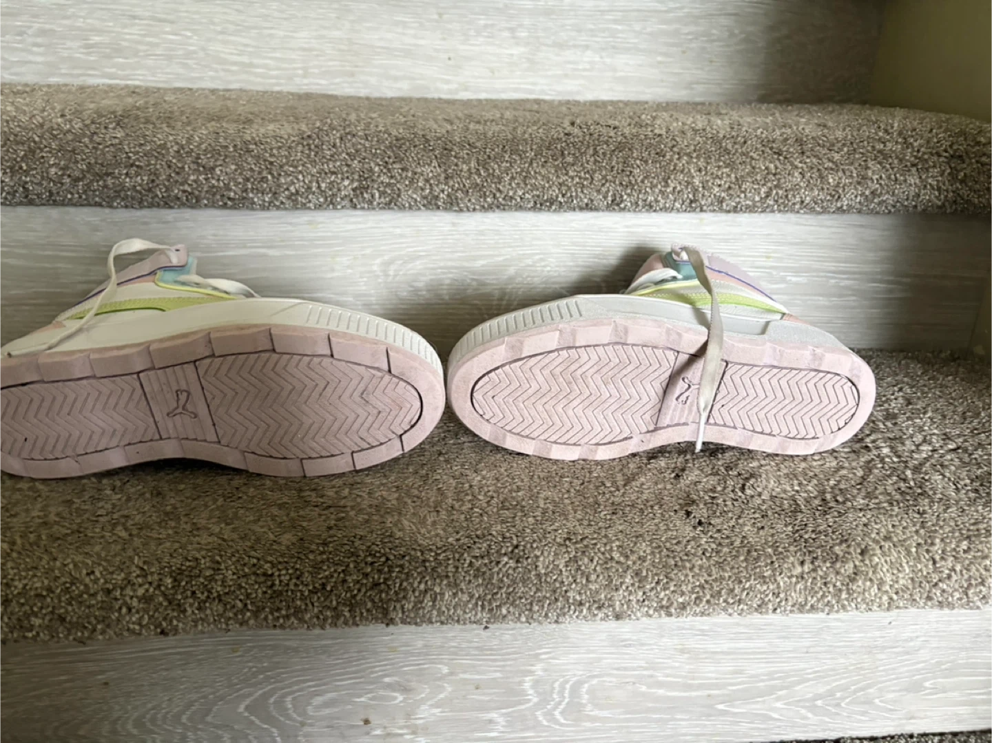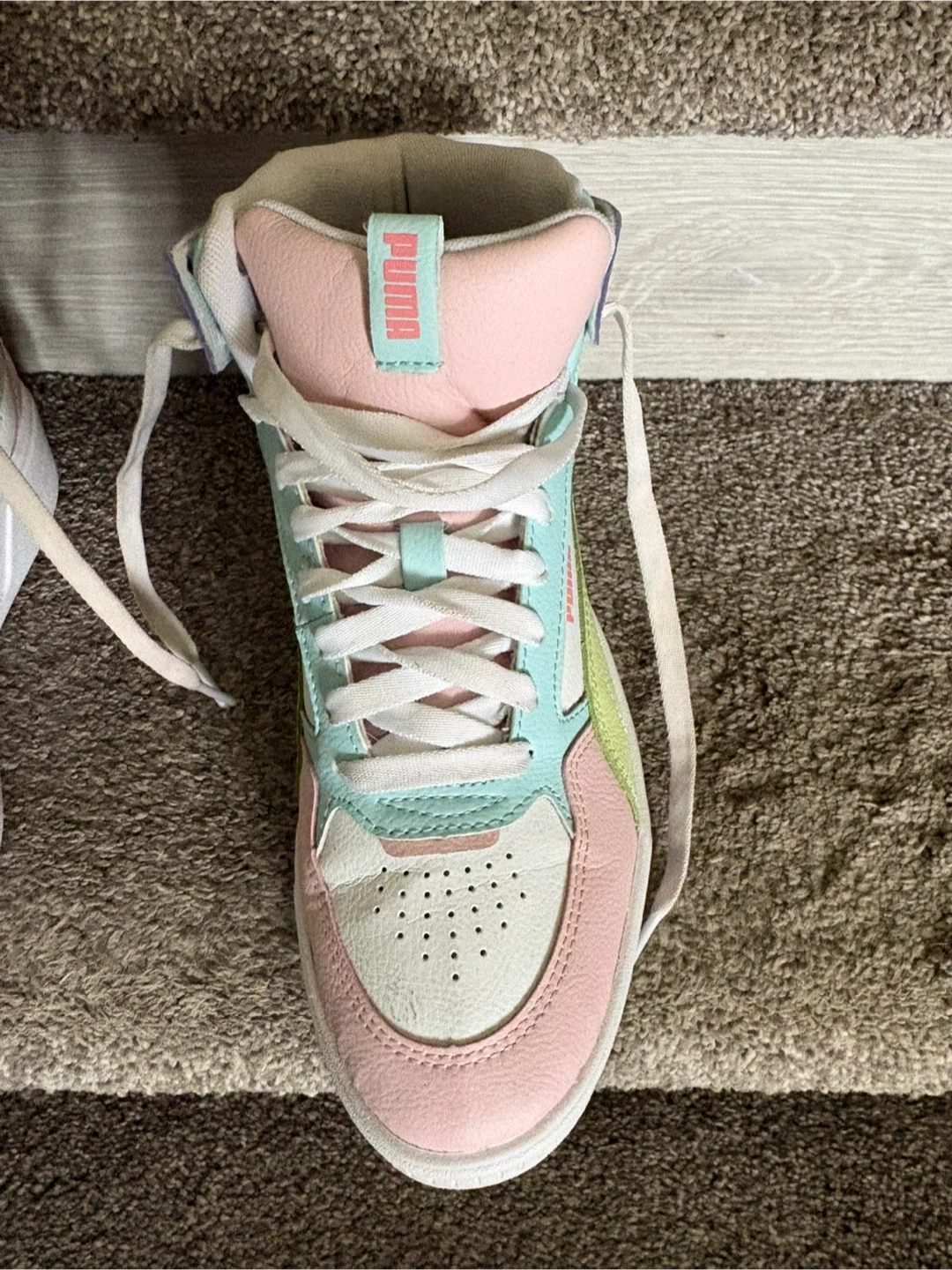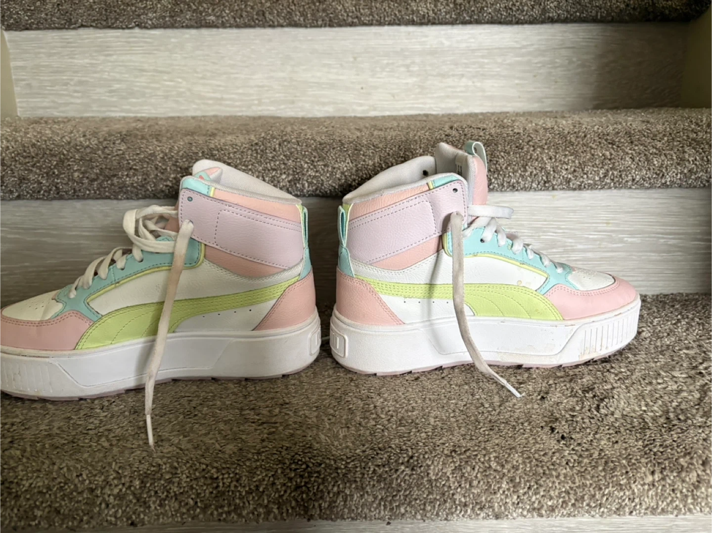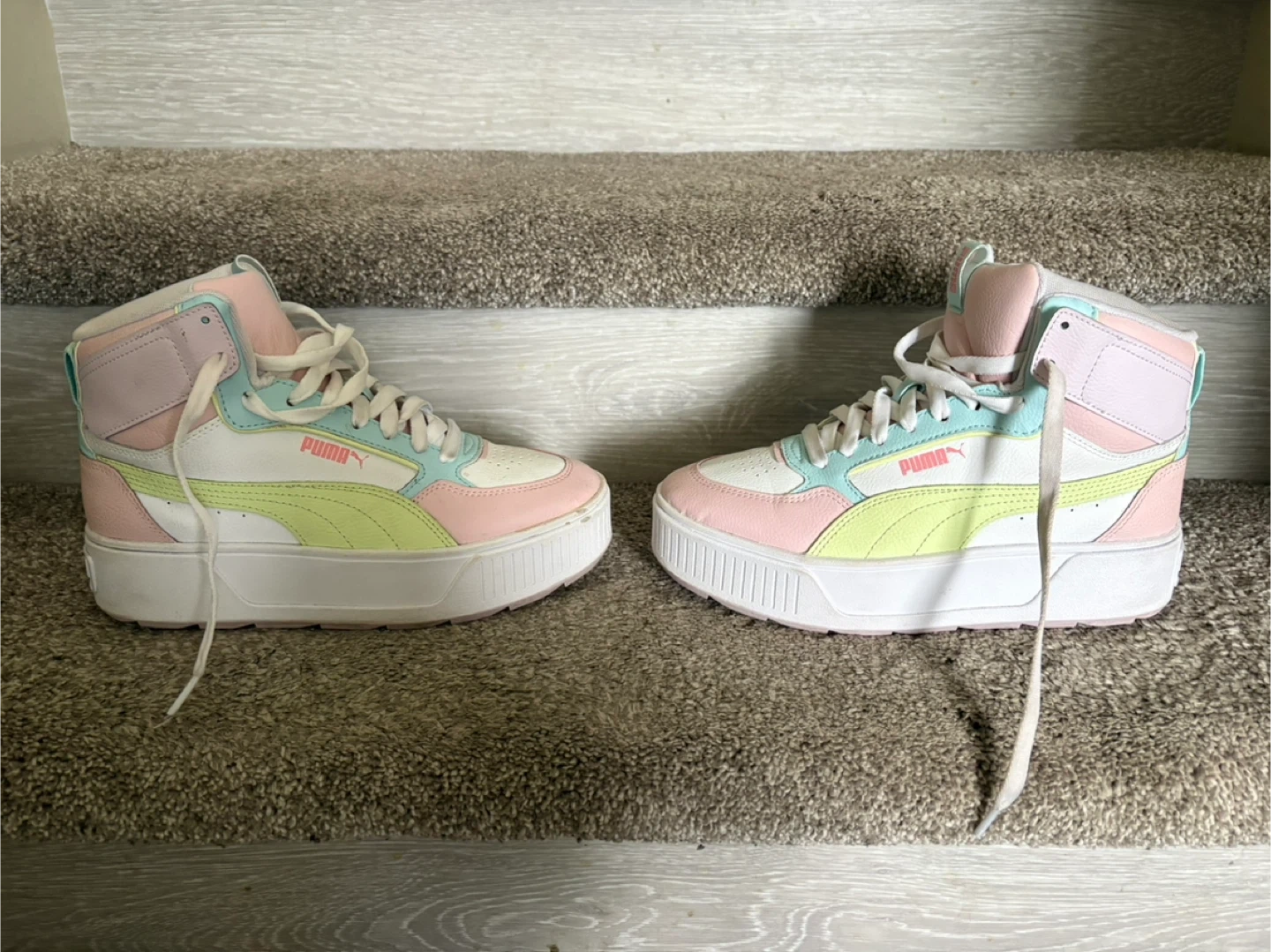 Puma women's high-top sneakers in a pastel colourway. These kicks have a white base with pastel pink, mint green, and yellow accents. Features a platform sole for added height. Great for casual wear!