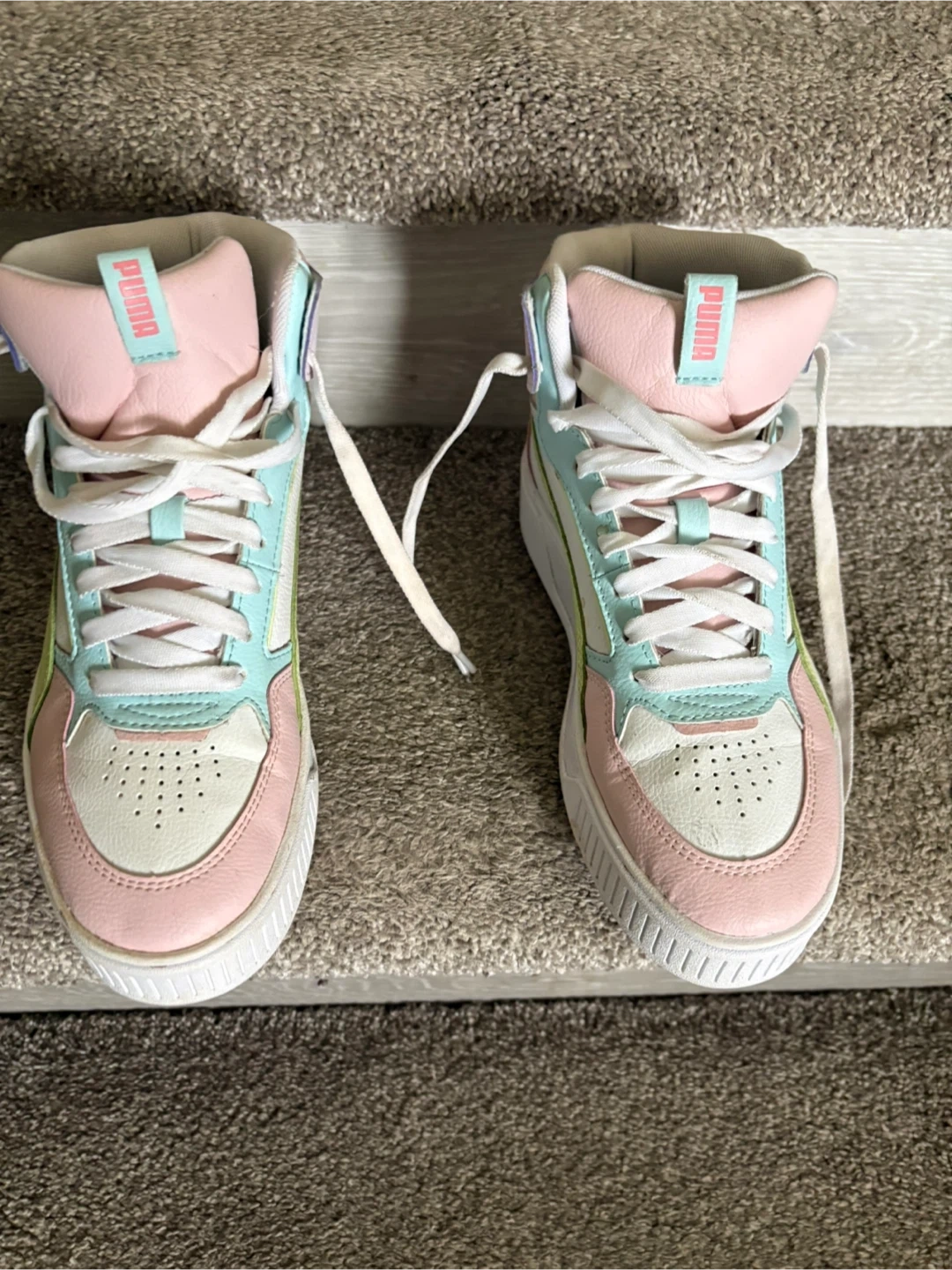 Puma women's high-top sneakers in a pastel colourway. These kicks have a white base with pastel pink, mint green, and yellow accents. Features a platform sole for added height. Great for casual wear!