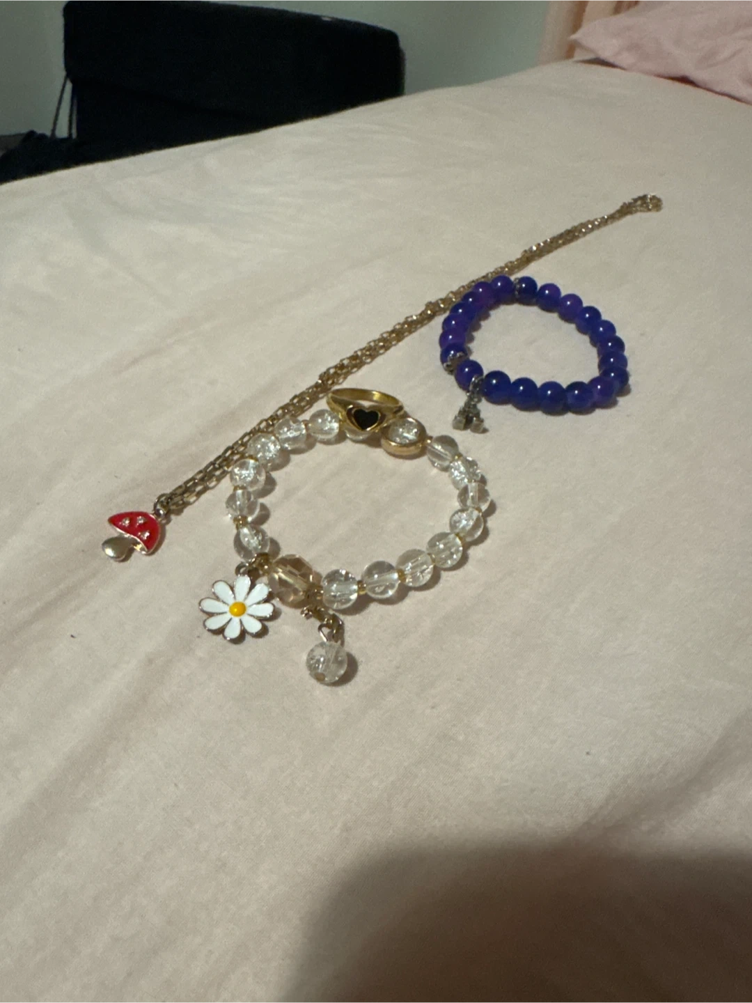 Selling a lot of costume jewellery. Includes a mushroom pendant necklace, a black heart ring, a clear beaded bracelet with a daisy charm, and a purple beaded bracelet with a Eiffel Tower charm