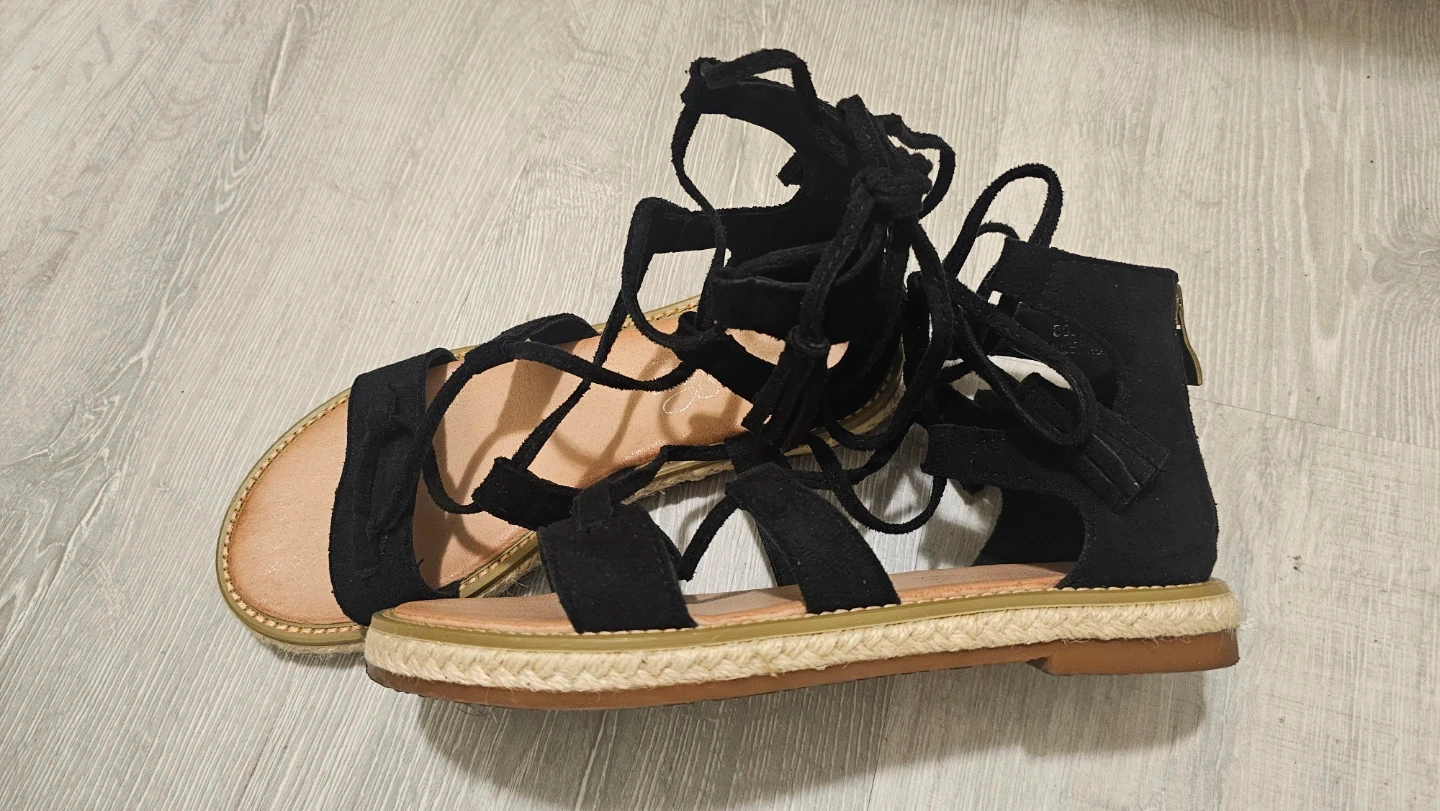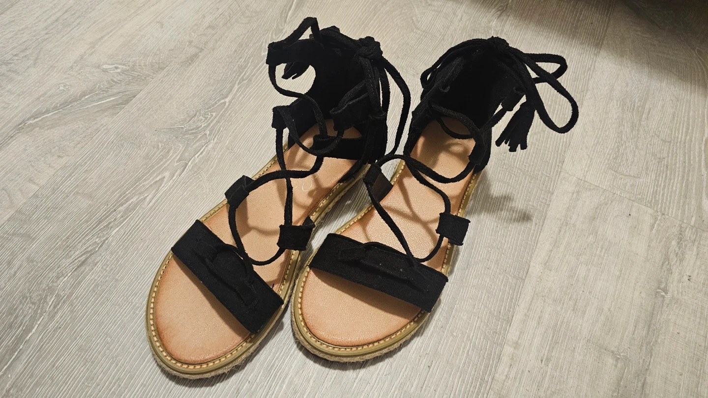 Stylish black suede gladiator sandals with lace-up detailing and decorative tassels. These flat sandals feature a comfortable espadrille-style sole. Perfect for adding a bohemian touch to any summer outfit!