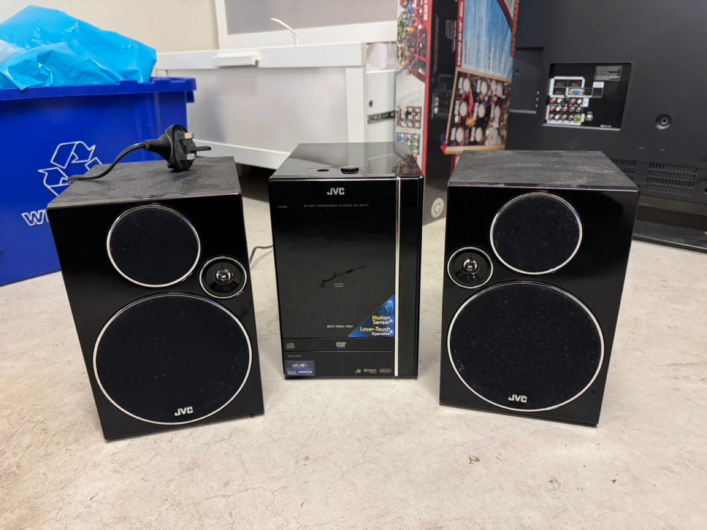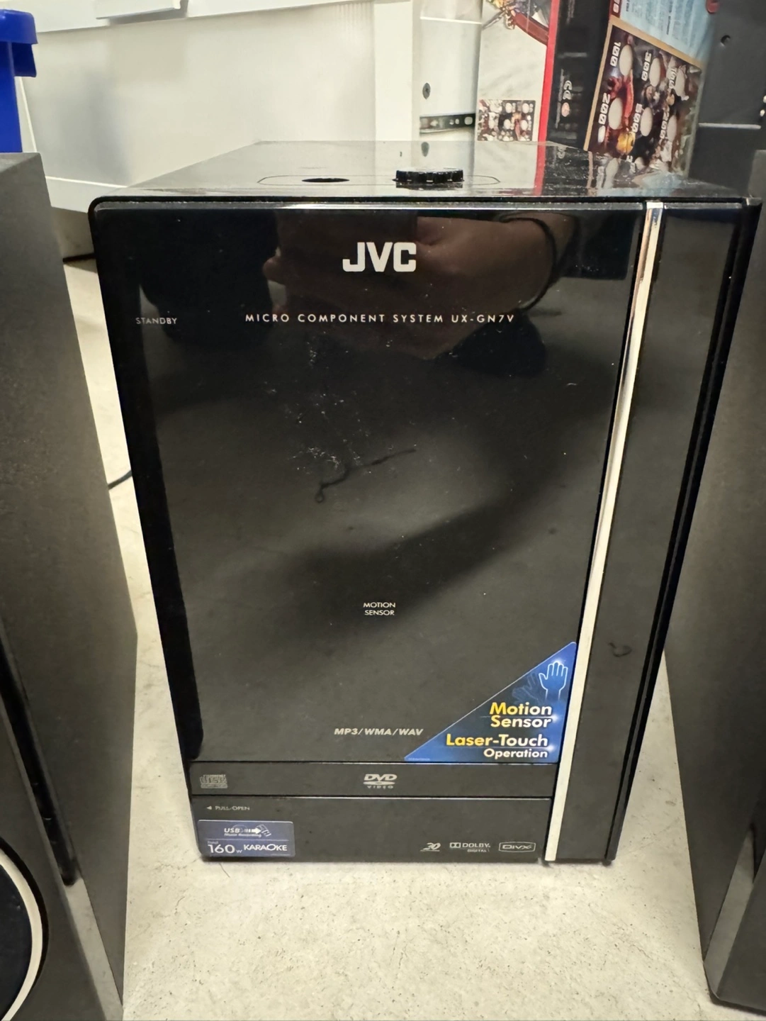 JVC Micro Component System Model UX-GN7V. Includes two speakers. Plays DVDs, MP3s, WMAs, and WAV files. It works totally fine and clean but it has UK/HK plug to use.