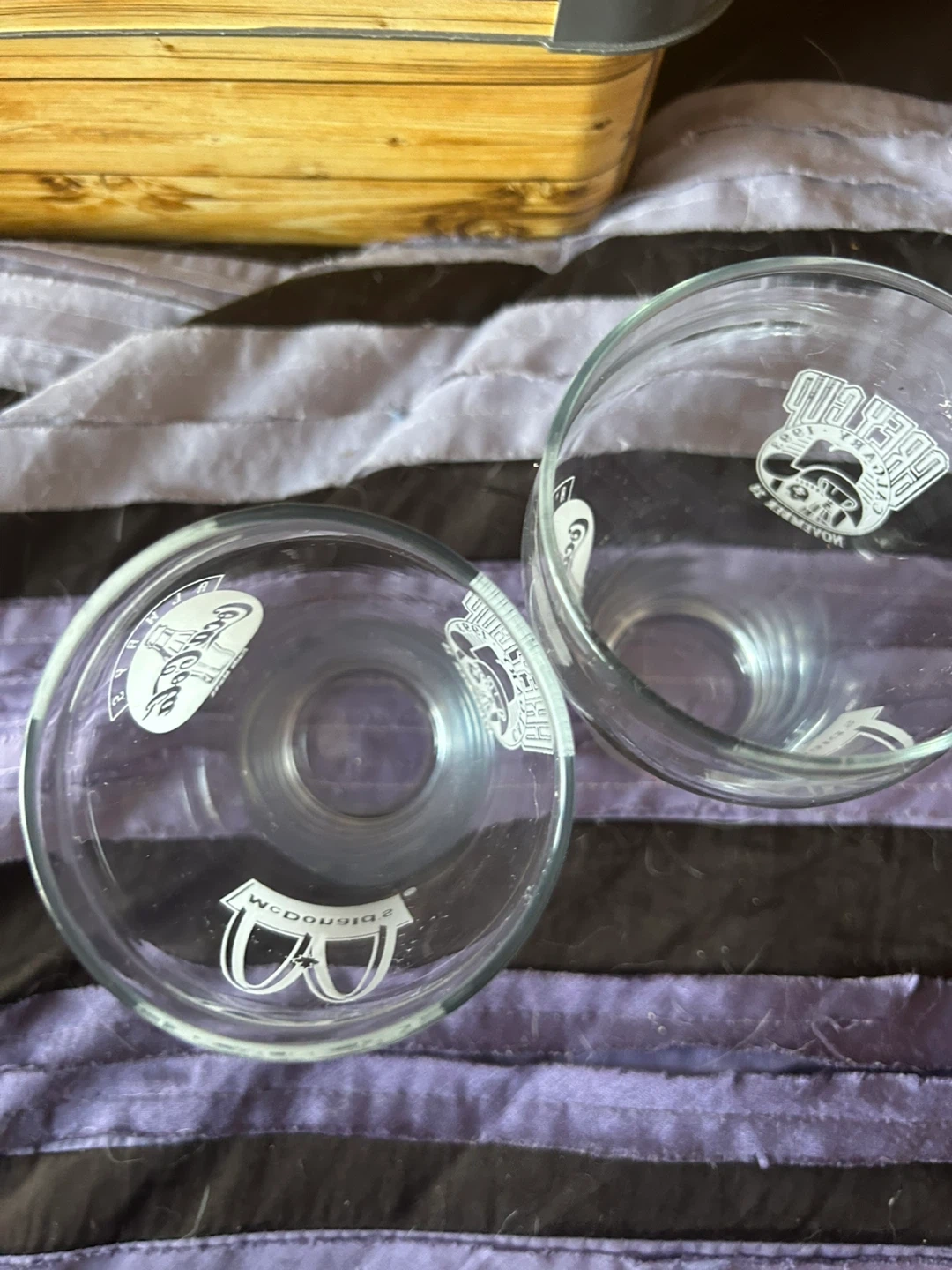 Two clear drinking glasses celebrating the 1993 Calgary Grey Cup. Each glass features Coca-Cola branding, and shows the McDonald's logo along with the grey cup design. These collectible glasses mark the November 28th event. They're perfect for memorabilia collectors or CFL fans!