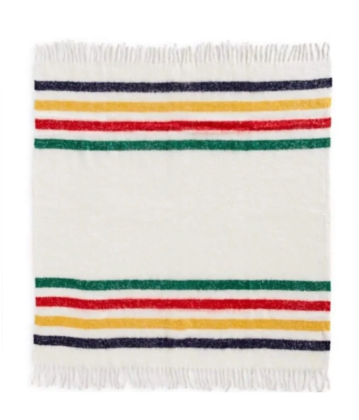 Soft, cozy throw blanket. Features iconic Hudson's Bay stripes. Fringed edges. Perfect for adding a touch of Canadian style to your home.