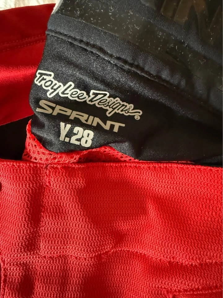 Clean Troy Lee Designs Sprint shorts. Size V.28. Bright red with white logos on the sides. Has a zipper pocket. Great for riding or just hanging out.