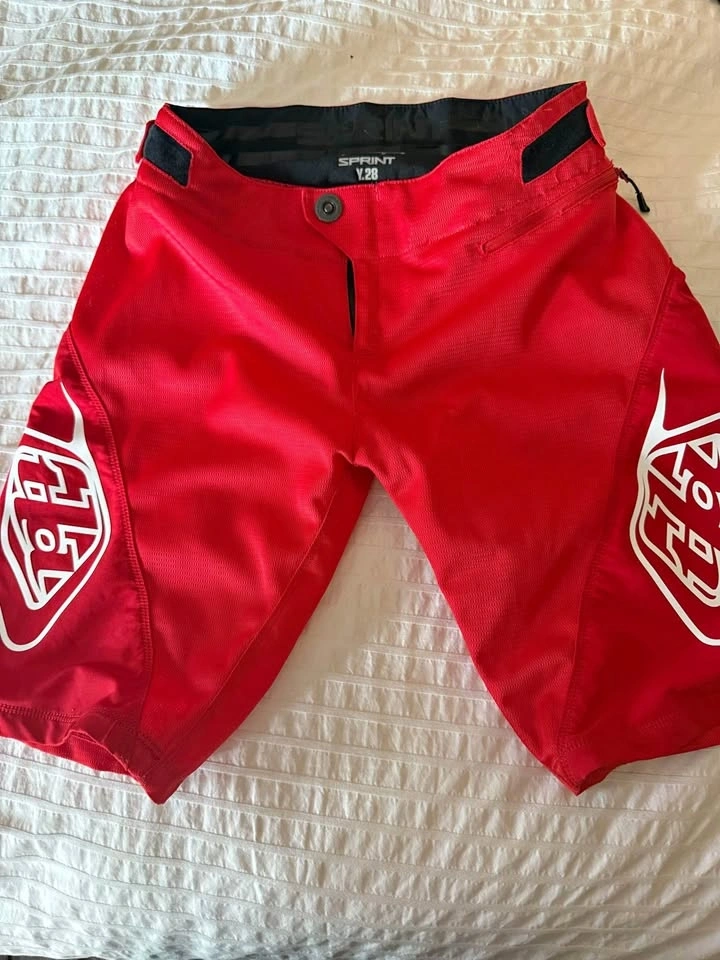 Clean Troy Lee Designs Sprint shorts. Size V.28. Bright red with white logos on the sides. Has a zipper pocket. Great for riding or just hanging out.