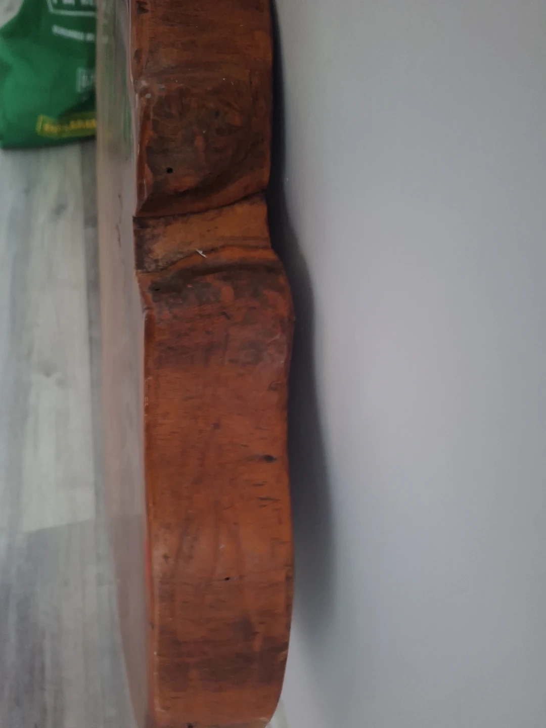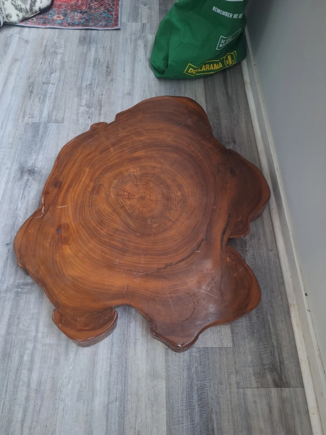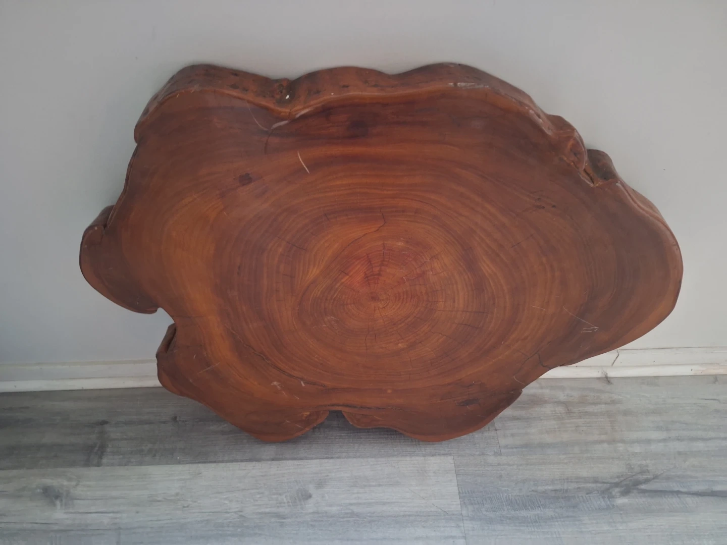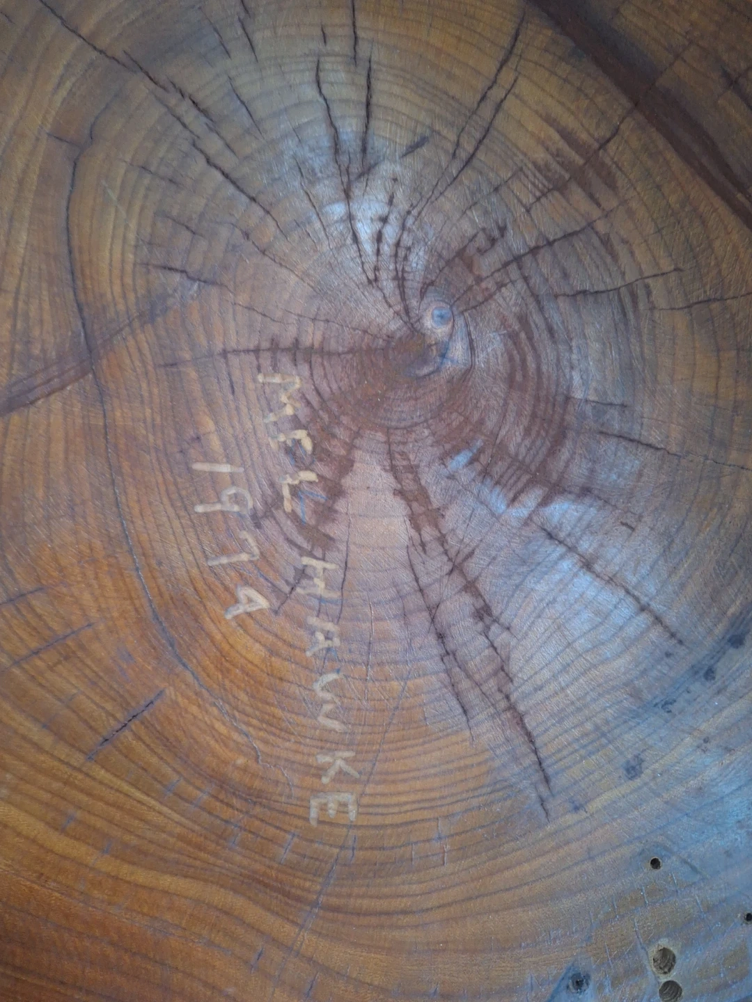 Beautiful live edge wood slice, possibly intended as a table or decorative piece. Features natural wood grain and a rustic, irregular shape. Some faint text appears on the back inscribed on the surface, reading "1974 HAWKE", suggesting it's from 1974.