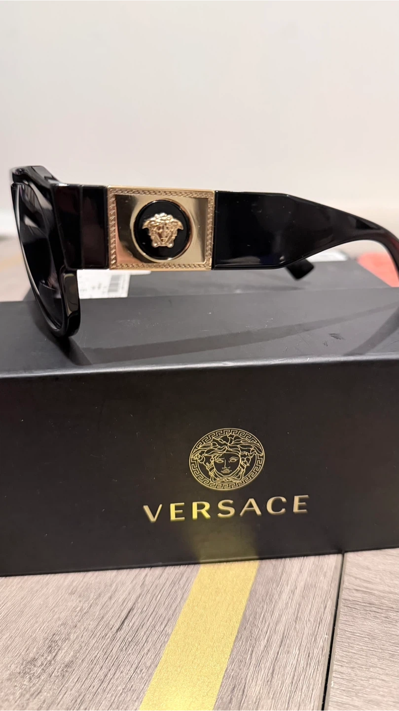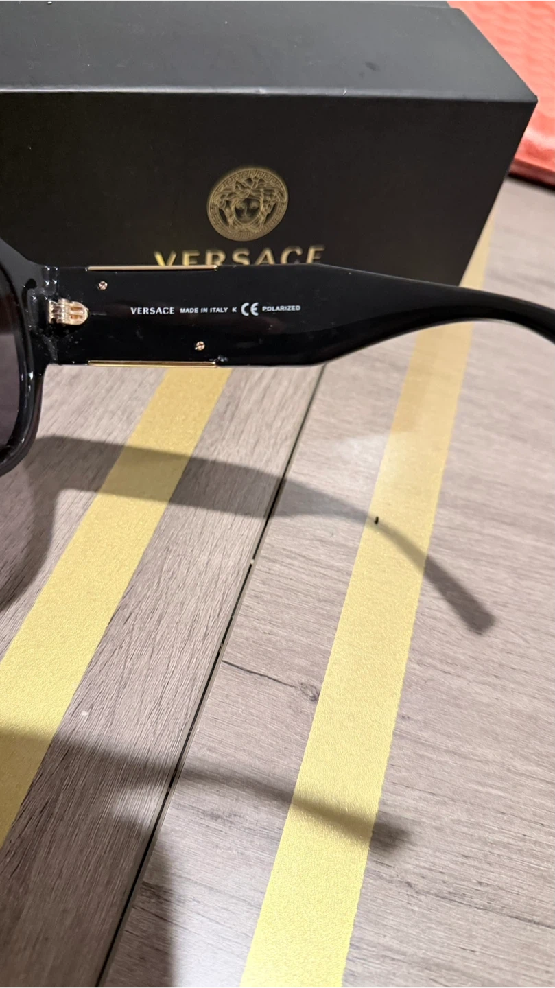 Versace VE3314 sunglasses. Black acetate frame with gold Medusa logo detail. Polarized lenses made in Italy. Comes with original box and case!