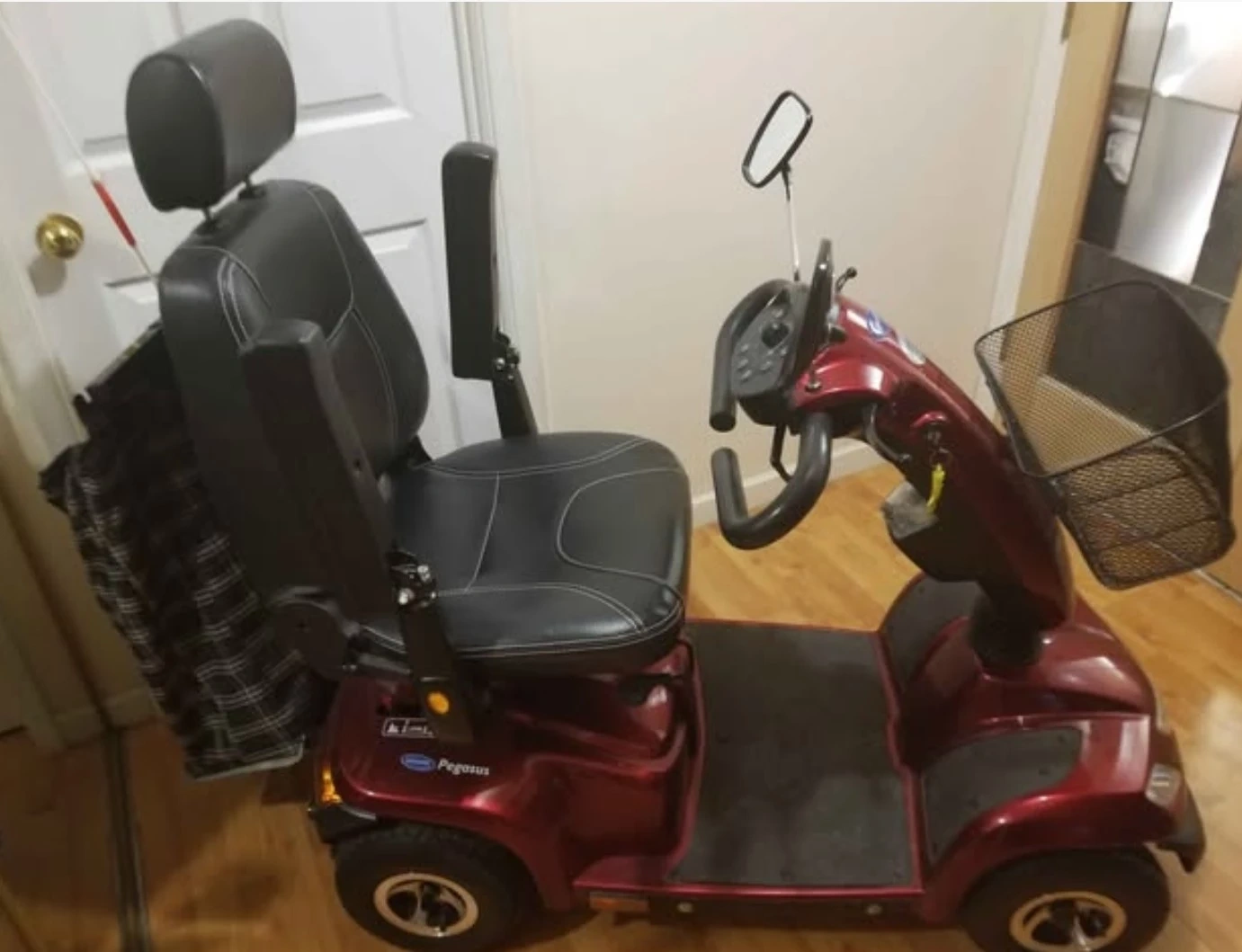 This is a red Pride Mobility Pegasus scooter. It features a comfortable black seat with white stitching and includes a front basket for storage. The scooter has adjustable armrests and a tiller for steering. It's suitable for navigating around the house or for short outdoor trips.