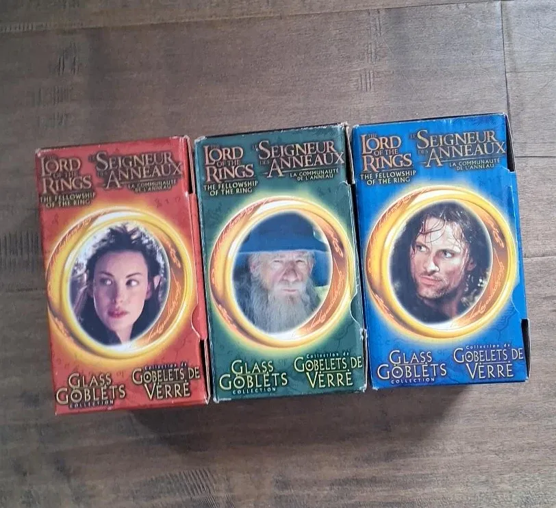 Collection of three glass goblets from The Lord of the Rings: The Fellowship of the Ring. Each goblet features a different character. These are collectible display pieces. 45 for each. Rare antique, special collectible.