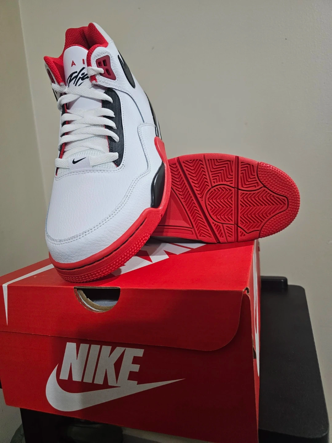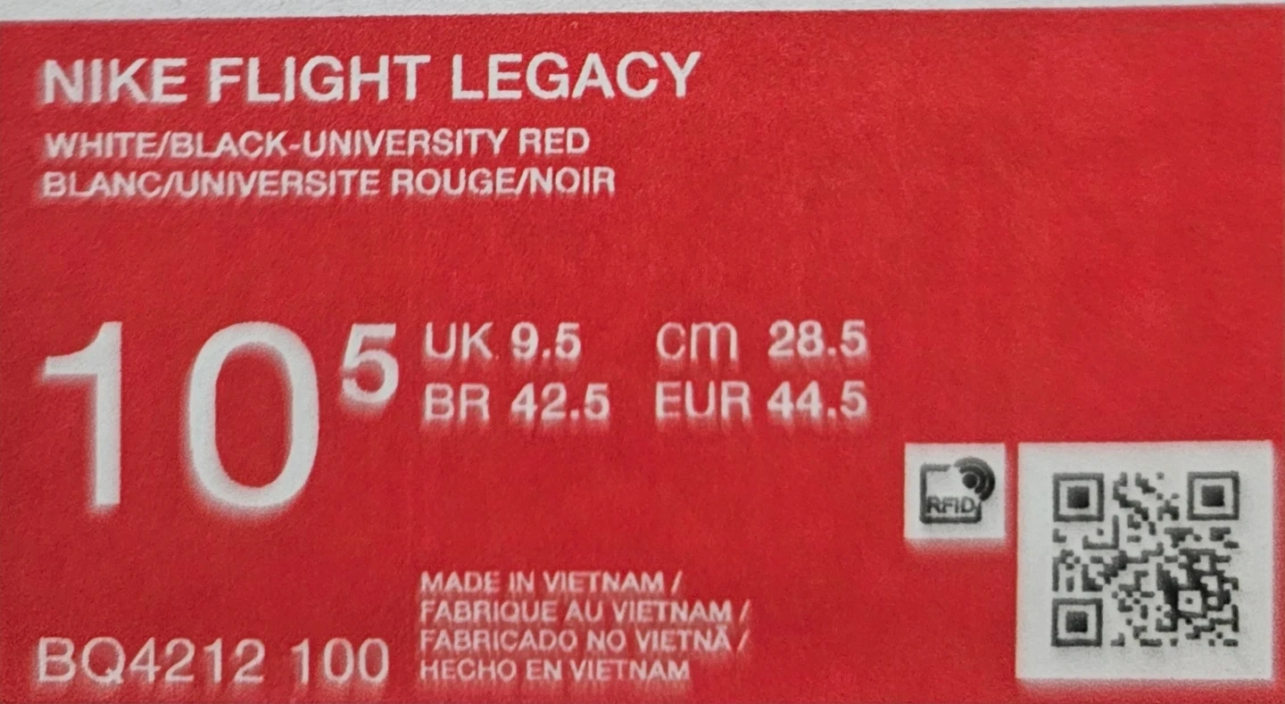 Brand new Nike Flight Legacy shoes in a classic white, black, and red colourway. These basketball-inspired sneakers come in their original box. Size 10.5.