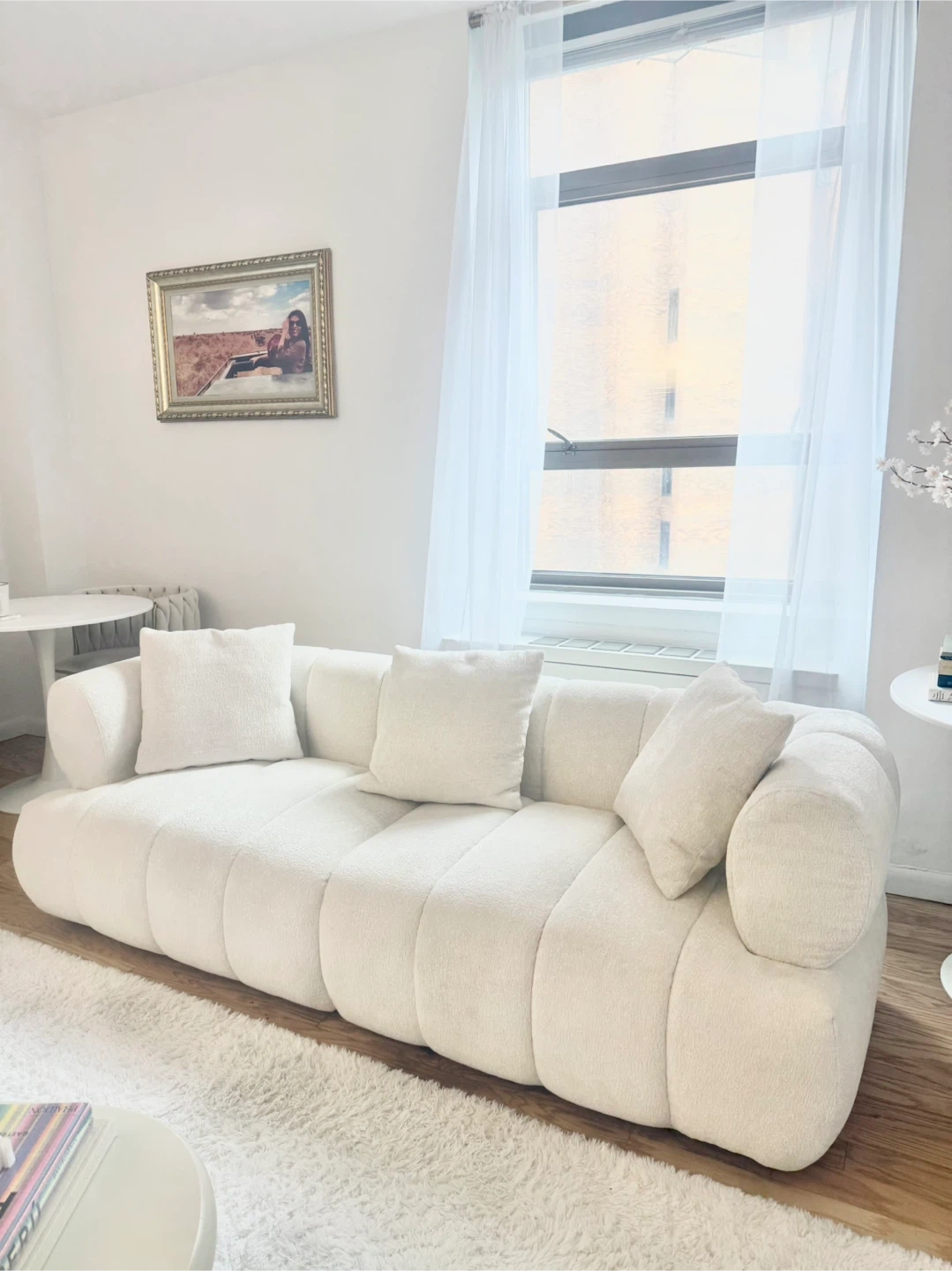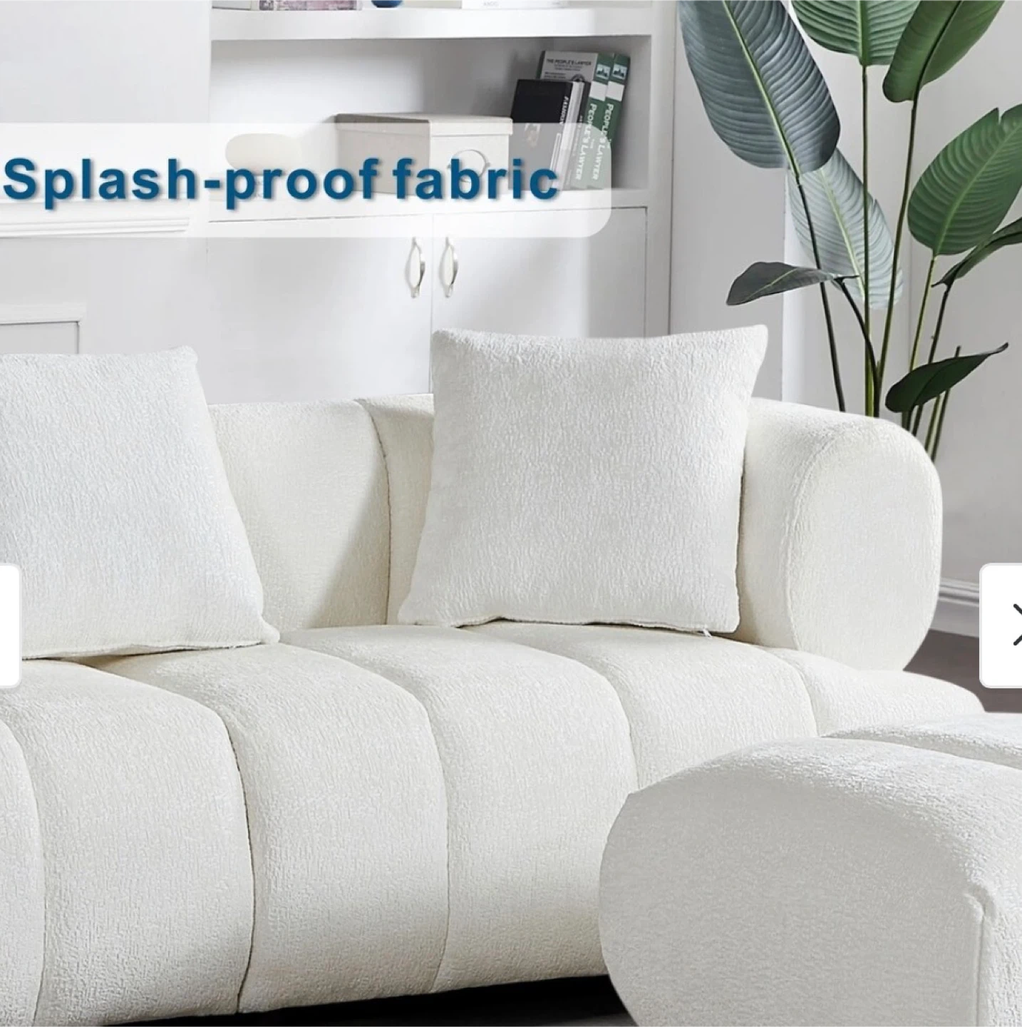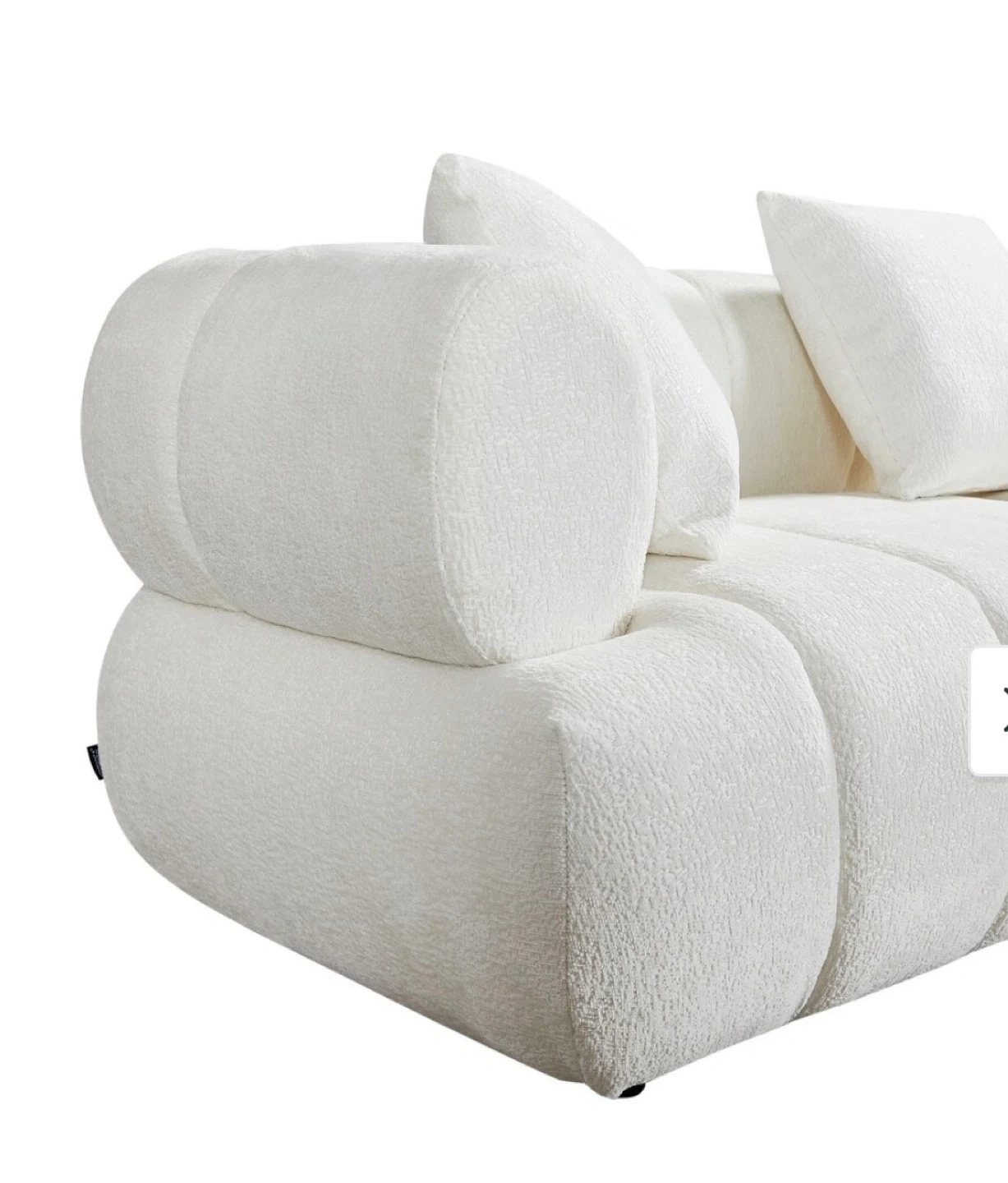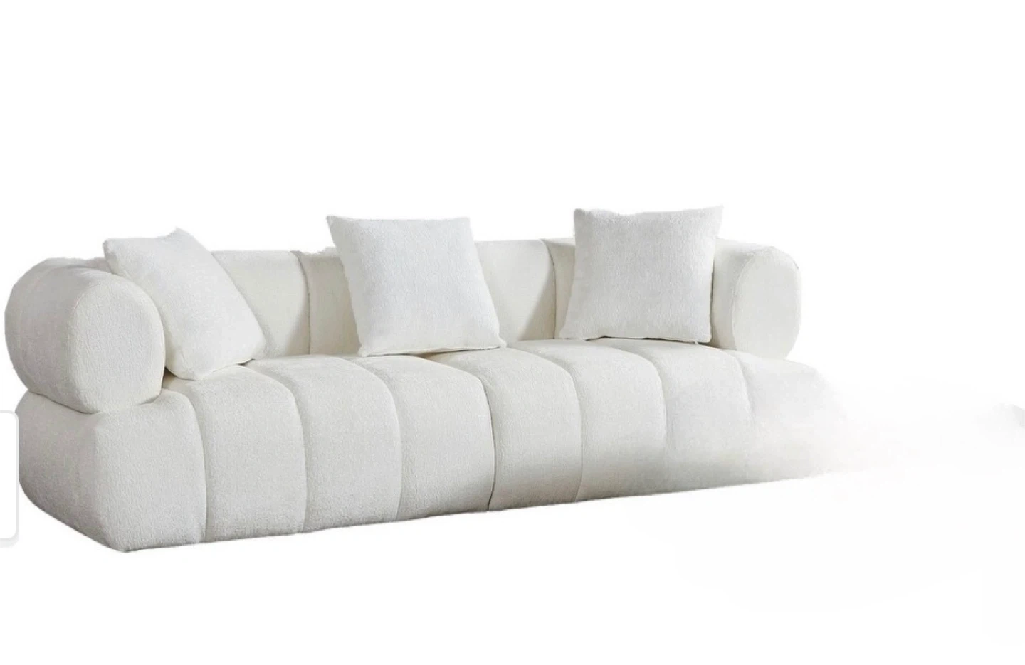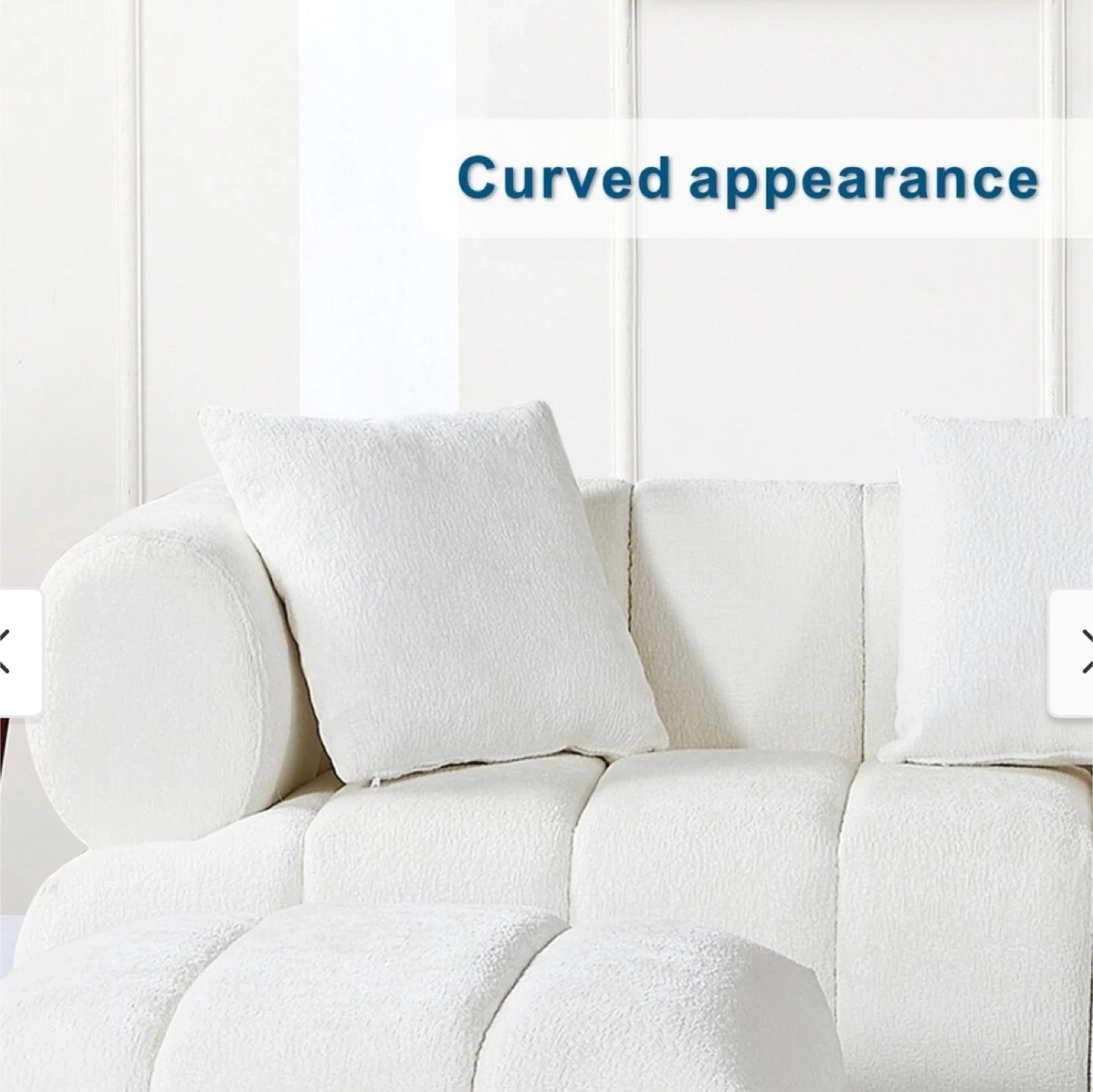 Modern white boucle sofa. Features a splash-proof fabric and a curved appearance. Measures 86.61" wide and 35.03" deep. Includes two three pillows.