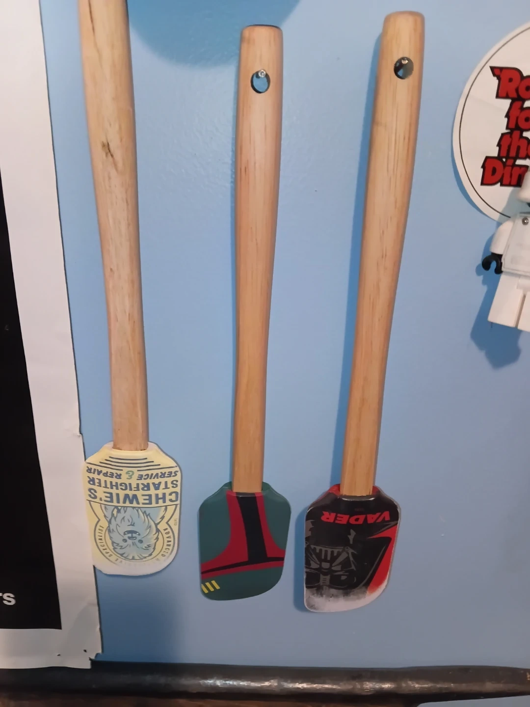 Three Star Wars-themed spatulas featuring Chewbacca, Boba Fett, and Darth Vader designs. Each spatula has a wooden handle and a silicone head. Great for any Star Wars fan's kitchen!