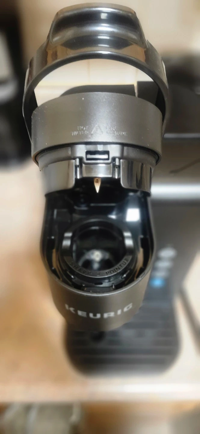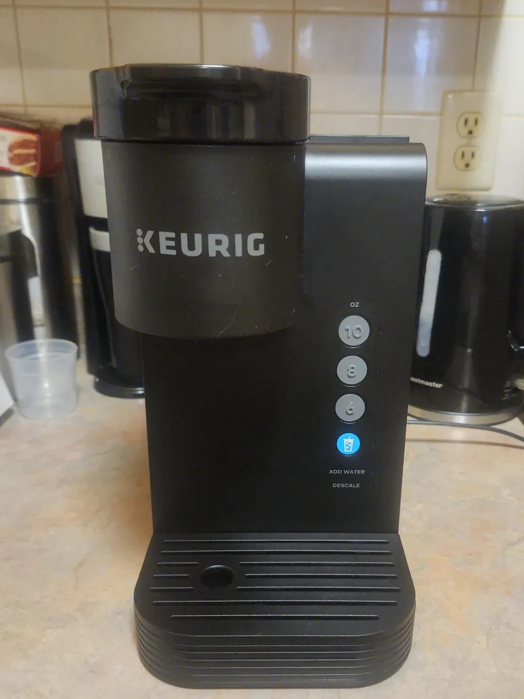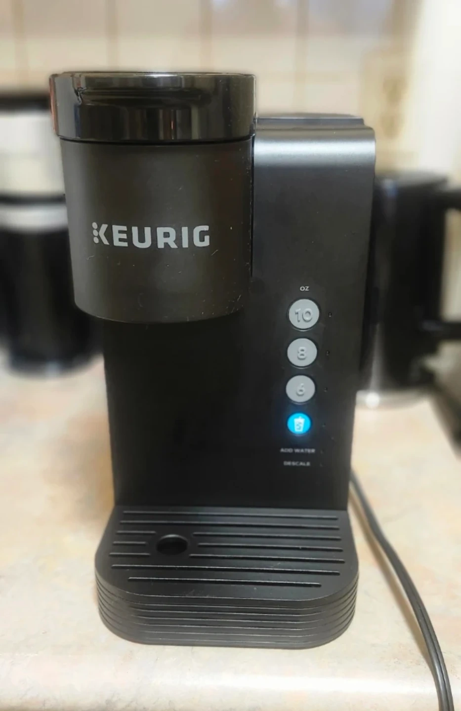 This Keurig coffee maker brews single cups of coffee. It has brew size options for 6, 8, and 10 ounces. The water reservoir is removable for easy filling. It's a convenient appliance for quick coffee.