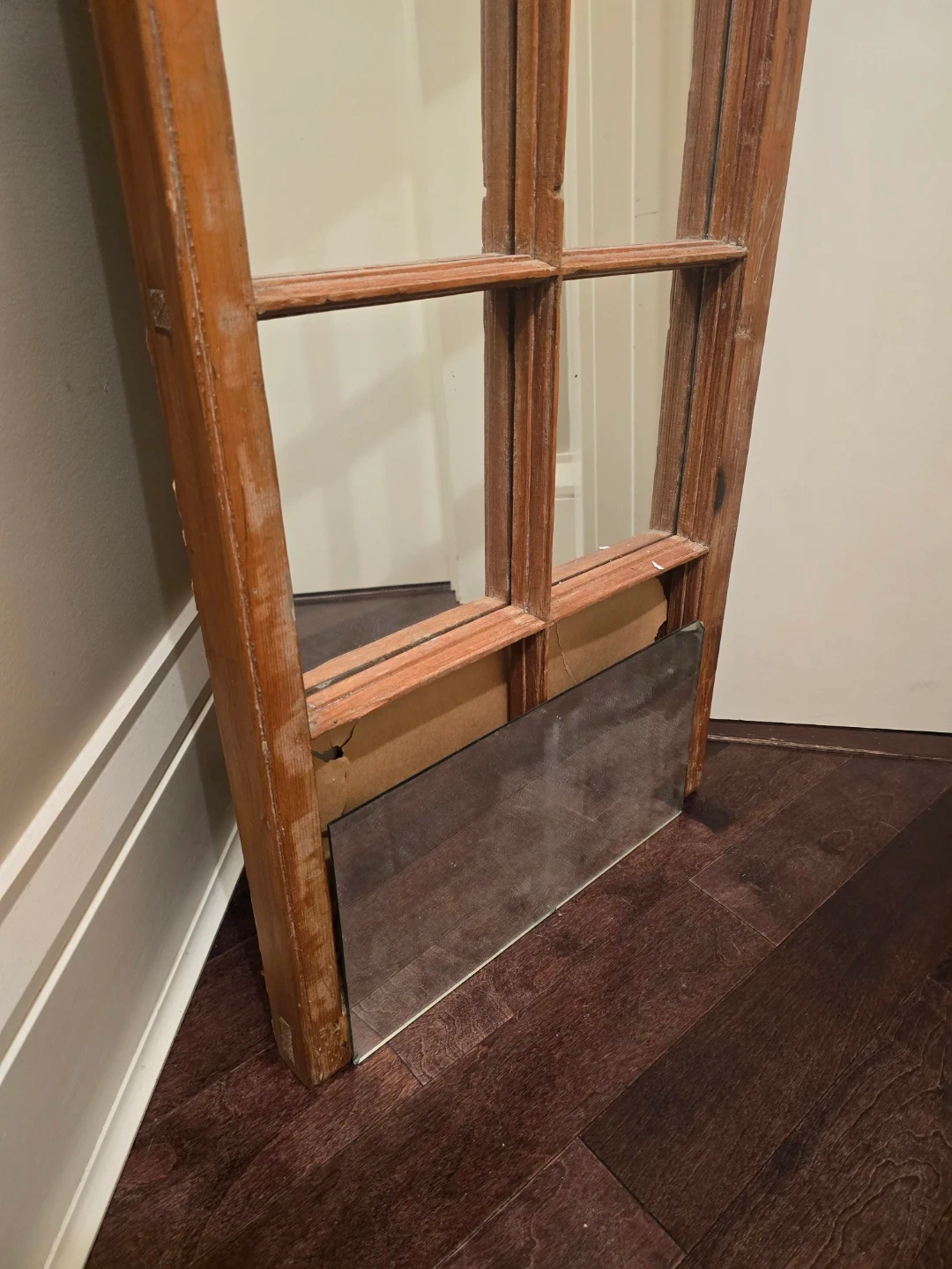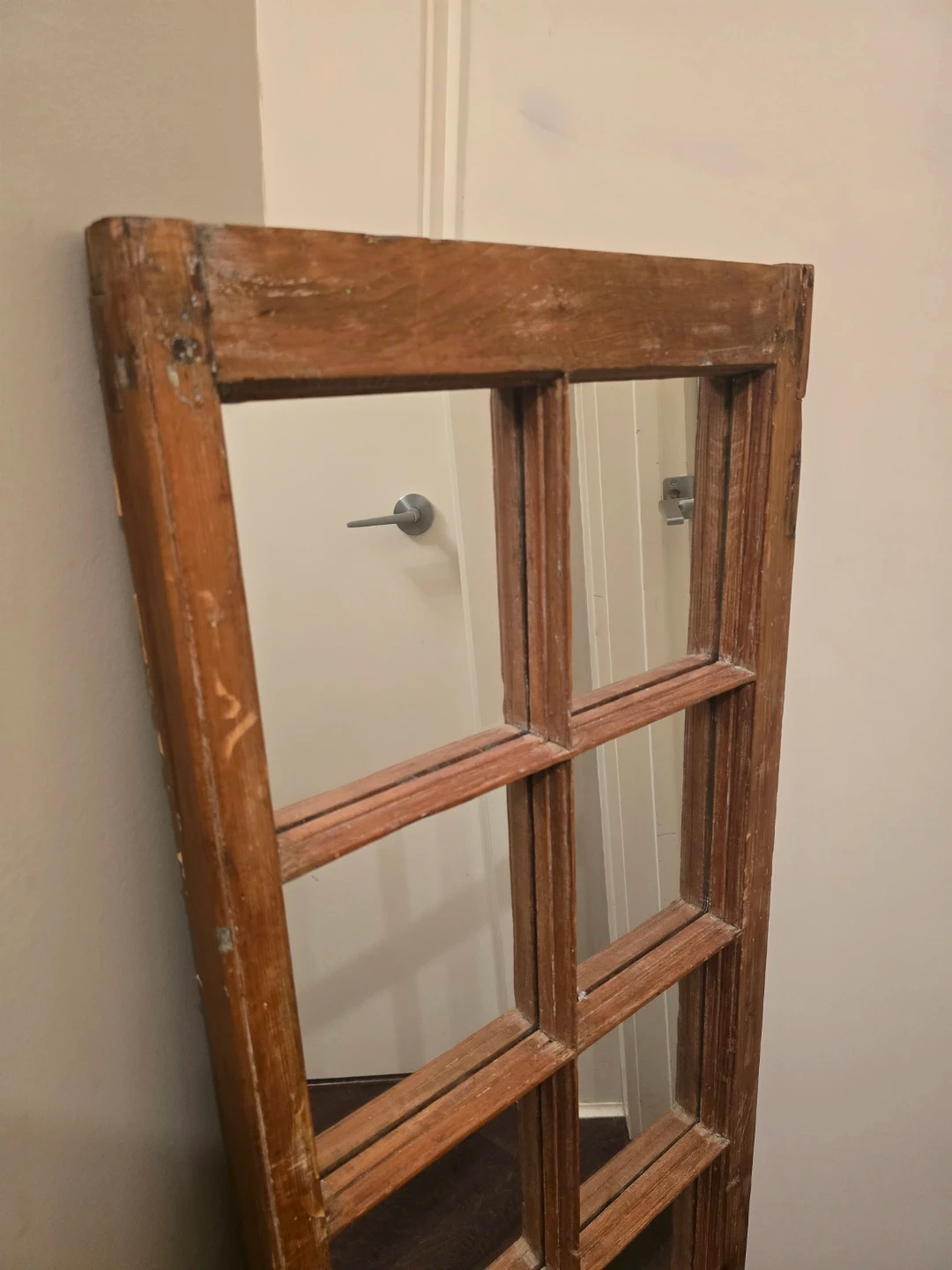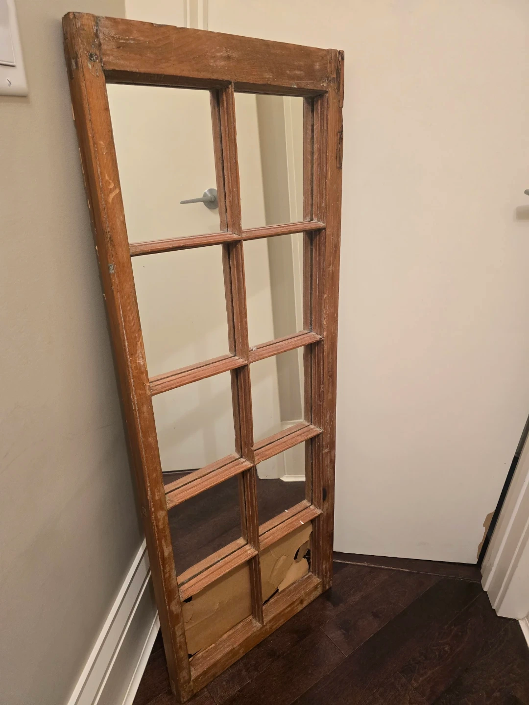 Wooden, rustic vintage style mirror. I had plans to sand and paint it but, never got around to finishing this project. My loss is your gain. And if you love the rustic style as is - this mirror just needs a little love to re-glue the one panel.