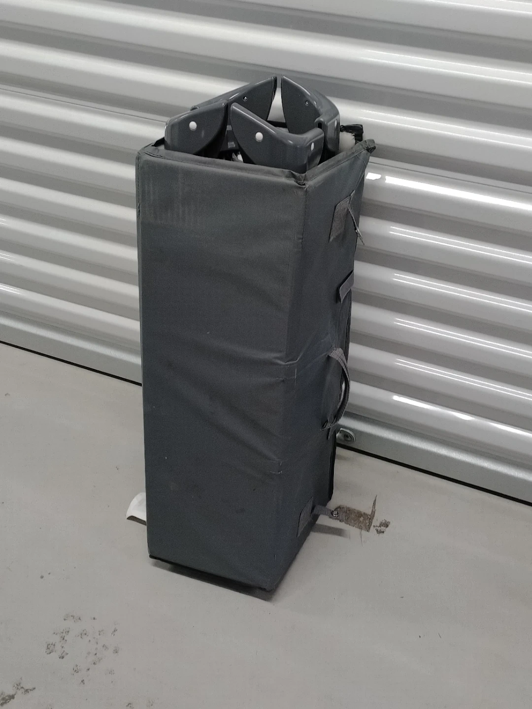 This is a folding playpen in a dark gray fabric. It has a sturdy frame and handles for carrying. It folds down compactly for easy storage. A handy item for moving items around!