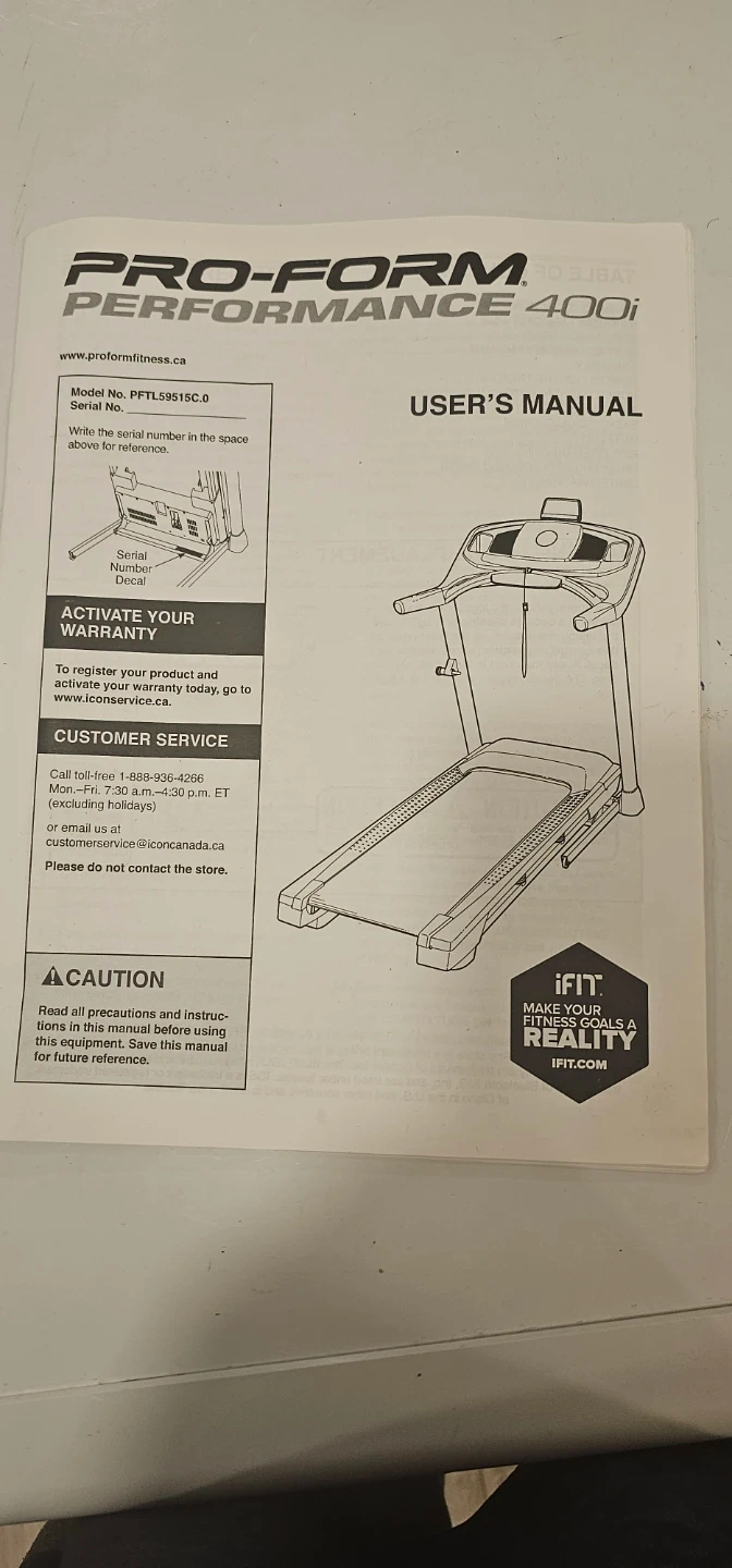 This is the user's manual for the Pro-Form Performance 400i treadmill. It includes important safety precautions and operating instructions. It details how to activate your warranty and contact customer service for support. Original manual included.