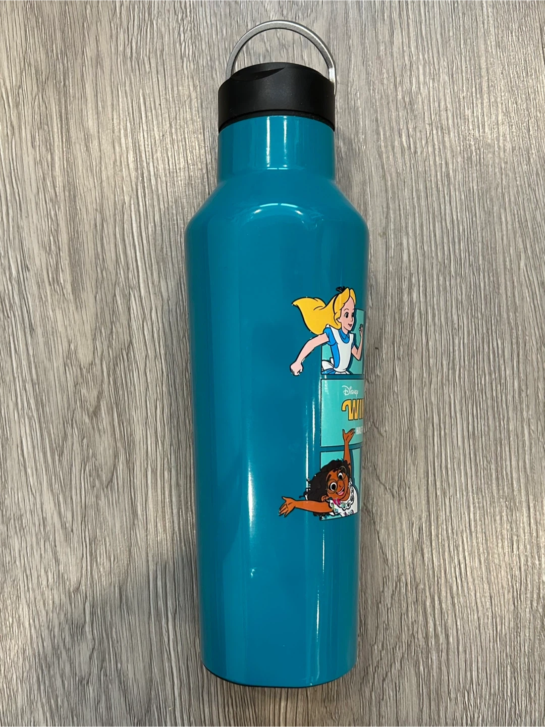 This is a teal Corkcicle water bottle featuring characters from Disney's Alice in Wonderland and Figment. It's from the 2023 Wine & Dine Half Marathon Weekend. The bottle has a flip-top straw lid and a carrying loop. 2 available! Buy one for $15 or 2 for $25. 20z bottle