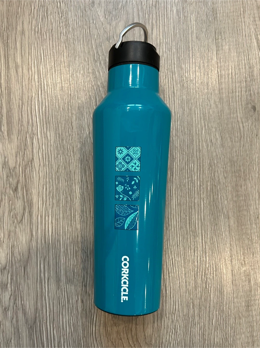 This is a teal Corkcicle water bottle featuring characters from Disney's Alice in Wonderland and Figment. It's from the 2023 Wine & Dine Half Marathon Weekend. The bottle has a flip-top straw lid and a carrying loop. 2 available! Buy one for $15 or 2 for $25. 20z bottle