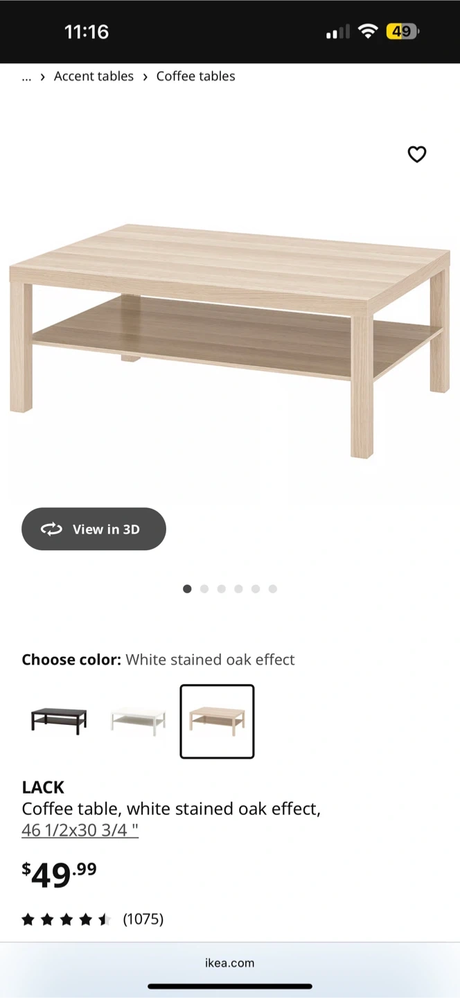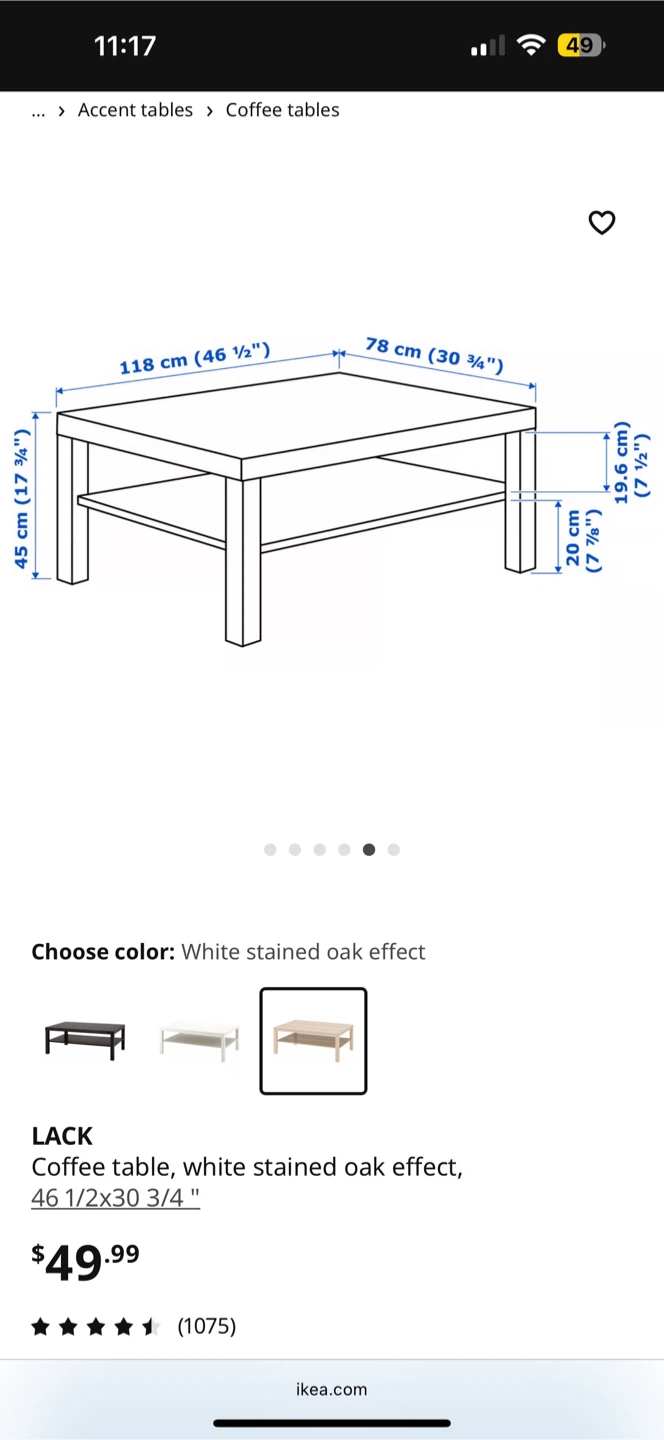 This is the IKEA LACK coffee table in a white stained oak effect finish. It's 46 1/2" x 30 3/4" and 17 3/4" tall. Comes with a lower shelf for extra storage space!