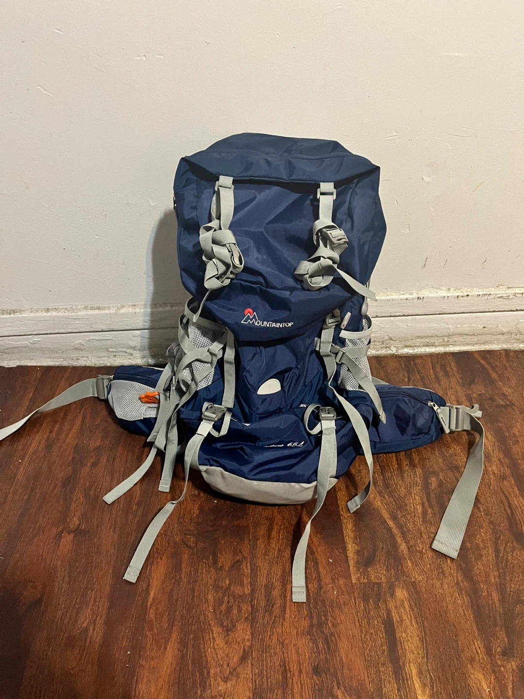 This is a MOUNTAINOP Adventure 65L backpack in blue. It features adjustable straps and multiple pockets. This pack's capacity makes it suitable for extended trips.Price is Firm.