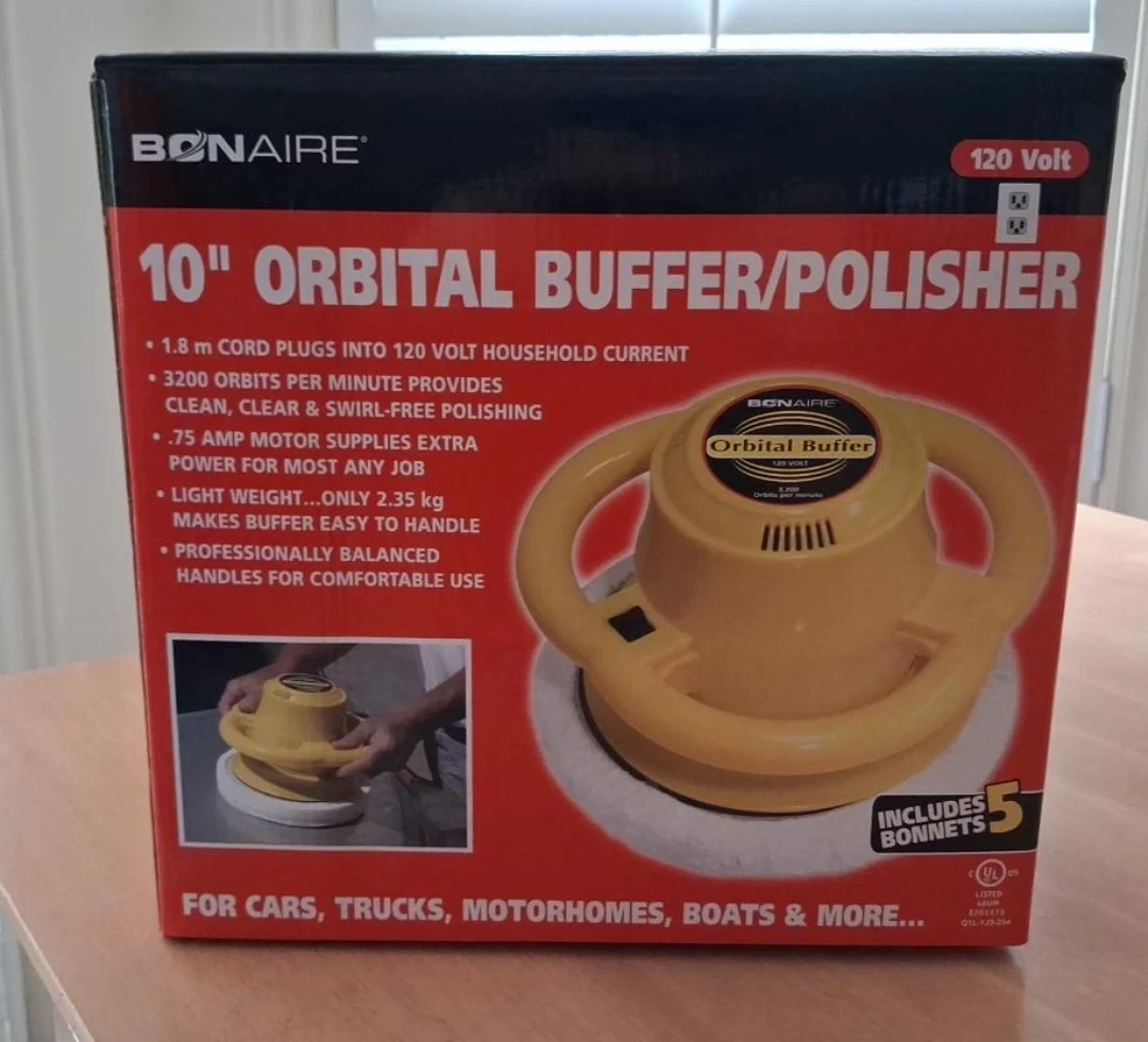 This Bonaire 10" orbital buffer/polisher comes with 5 bonnets. It features a 1.8 m cord and runs on 120-volt household current. It offers 3200 orbits per minute with a .75 amp motor for extra power. The unit weighs only 2.35 kg and has professionally balanced handles for comfortable use.