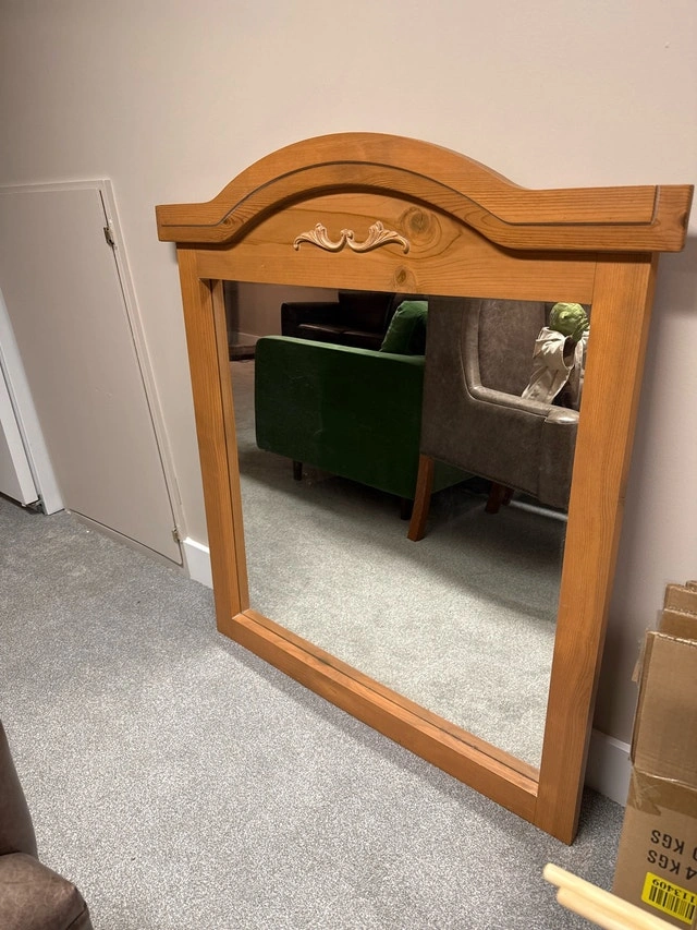 This large decorative mirror features a beautiful light brown wooden frame and is in good condition. It would be a great addition to any room, adding both functionality and style. Cash accepted.