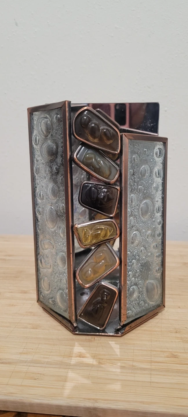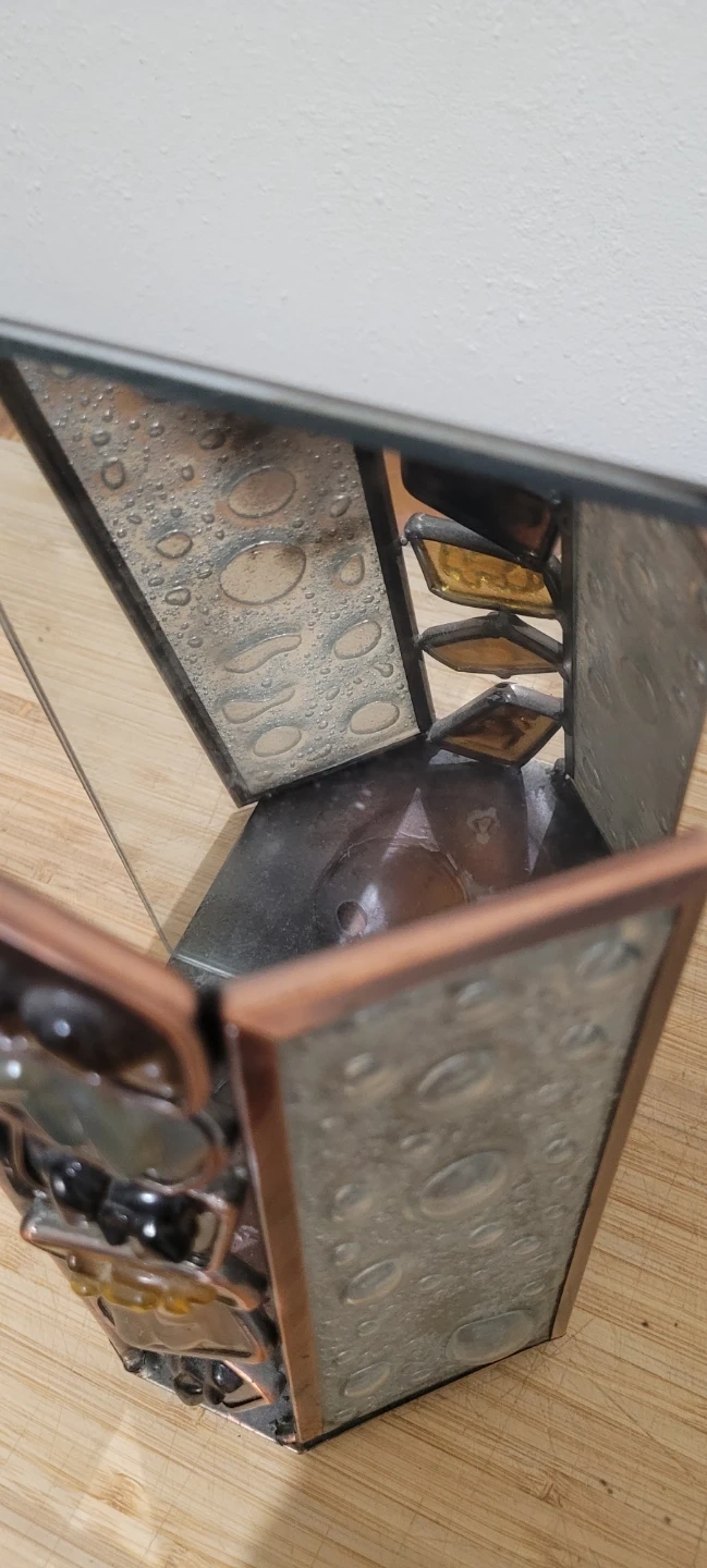 Vintage candel holder thingy, very unique and give off a sick vibe. Mirror from behind the glass amplifies the light alot