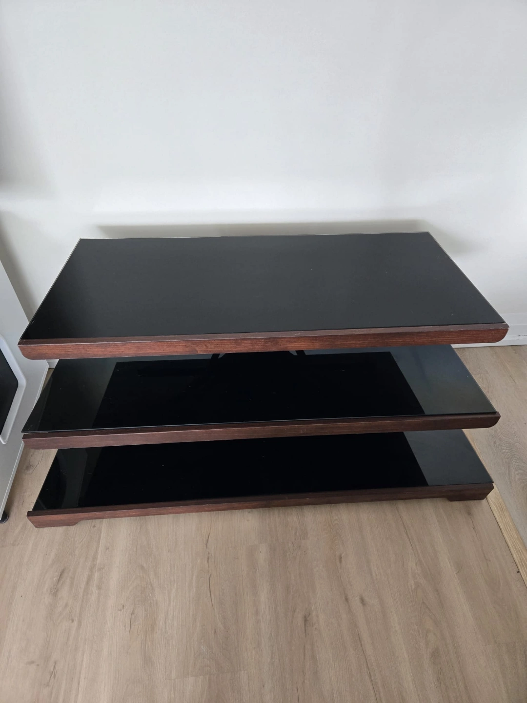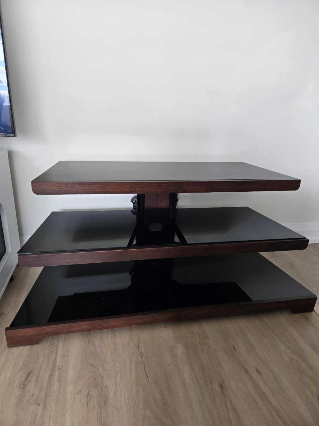 Sleek three-tier TV stand. Dark wood frame. Black glass shelves. Modern design. Great for living room.