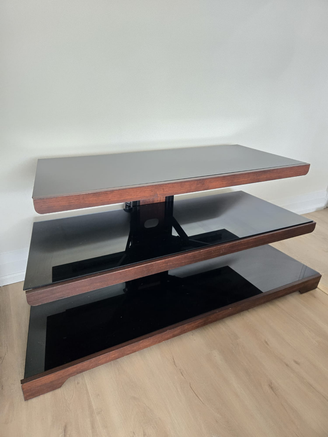 Sleek three-tier TV stand. Dark wood frame. Black glass shelves. Modern design. Great for living room.