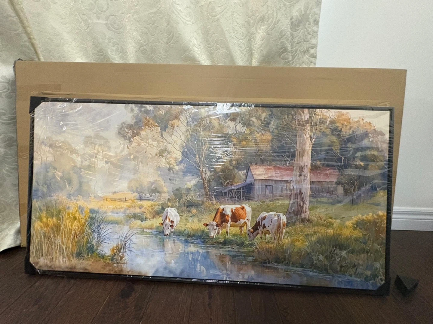 Framed watercolour painting depicting a serene farm landscape with cows by a stream. It's a beautiful pastoral scene, perfect for adding a touch of country charm to any room. The artwork comes in its original box, ready for display.