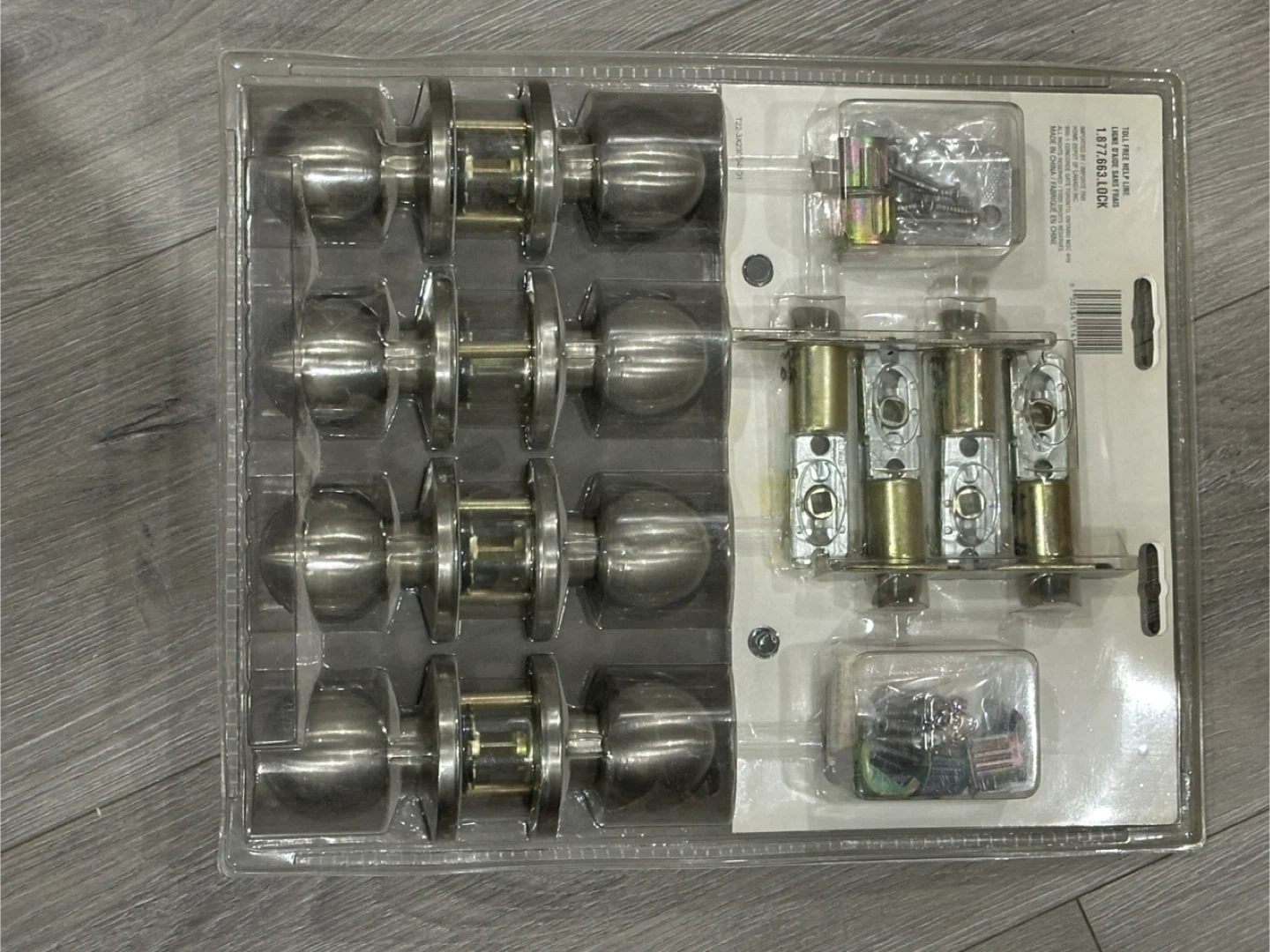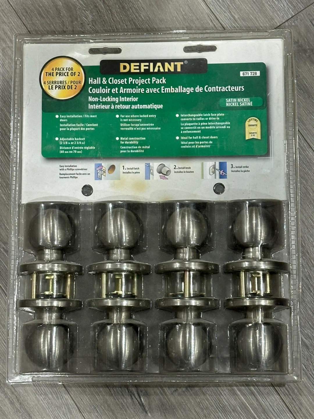 This is a 4 pack of Defiant Hall & Closet Project door knobs. They are non-locking interior knobs. This pack includes all necessary hardware for installation, including latches and strike plates. They're finished in satin nickel. Brand New in sealed factory packaging!
