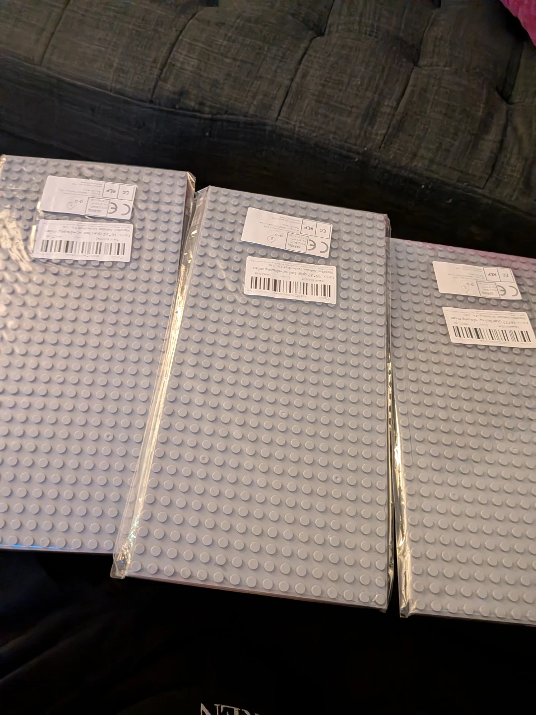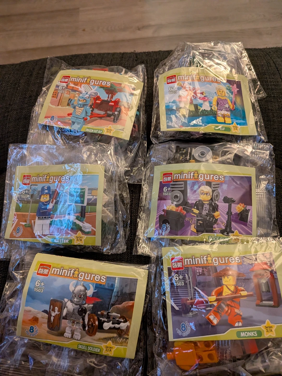 This lot includes several packs of building block minifigures, each with a unique character like Skull Soldier and Monks. Also included are 4-packs of Brickyard Building Blocks baseplates, measuring 10 in. x 10 in. each. Ages 4+ are sf,f m