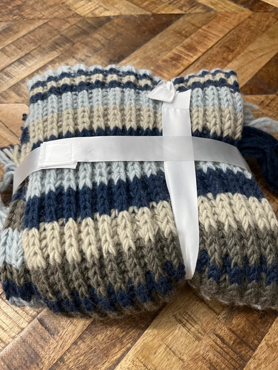 🥕A cozy knit scarf featuring a striped pattern in navy, tan, light blue, and grey. It's finished with a row of fun tassels. Perfect for adding warmth and style to your winter outfits! Never used.