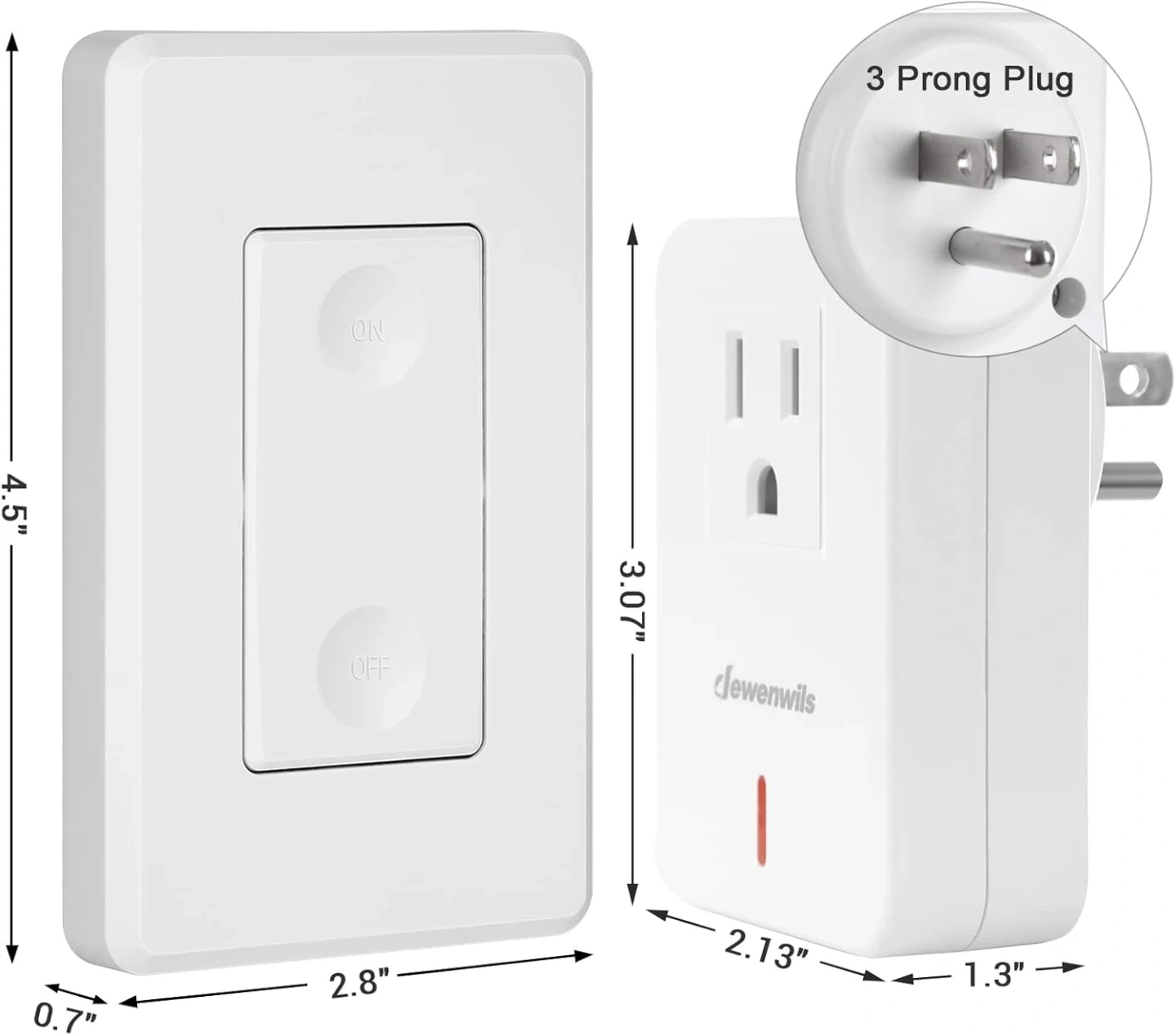 This wireless remote control outlet and wall switch system offers a 100ft RF remote range, working through walls and doors. It's plug and play, requires no wiring or WiFi, and includes a battery. The outlet measures 3.07" x 2.13" x 1.3", ideal for saving space and not blocking the second outlet.