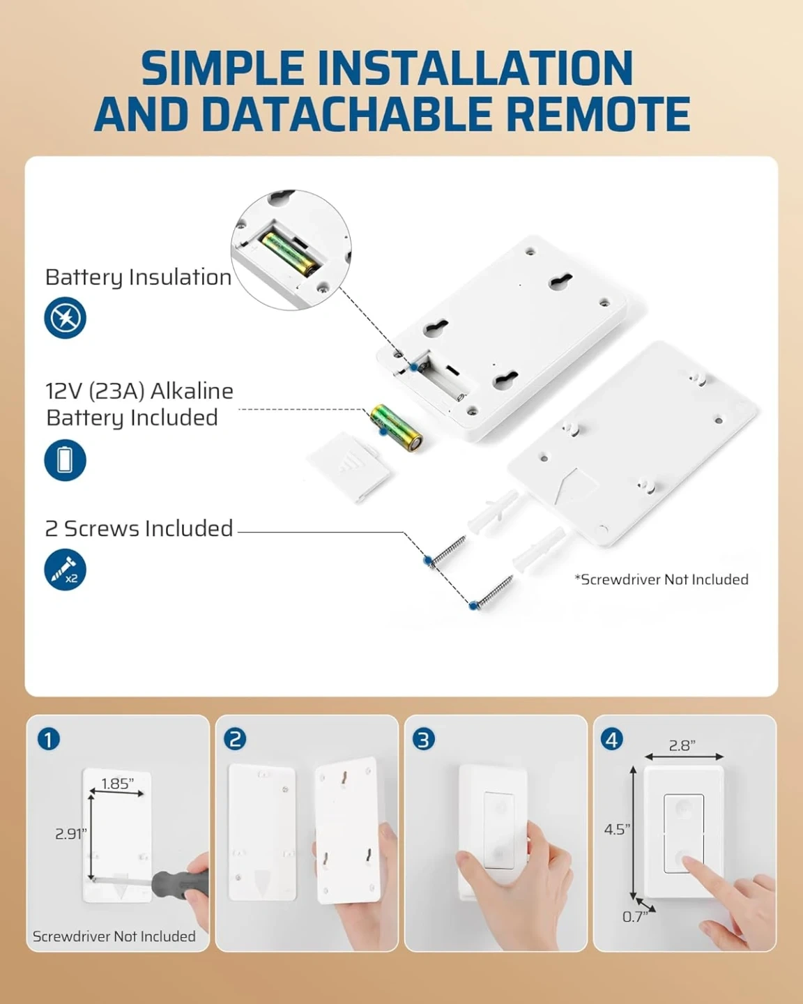This wireless remote control outlet and wall switch system offers a 100ft RF remote range, working through walls and doors. It's plug and play, requires no wiring or WiFi, and includes a battery. The outlet measures 3.07" x 2.13" x 1.3", ideal for saving space and not blocking the second outlet.