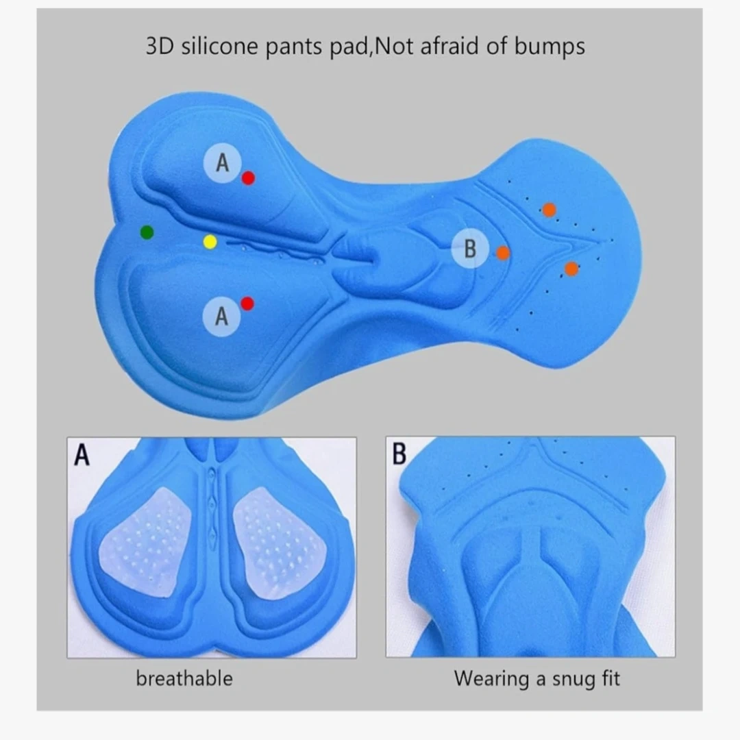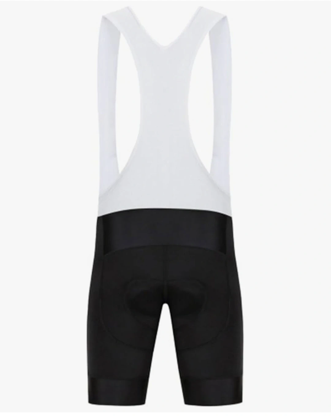 These black and white cycling bib shorts are made of stretchy material for comfort. They feature a 3D silicone padded insert for shock absorption. Breathable and designed for a snug fit.