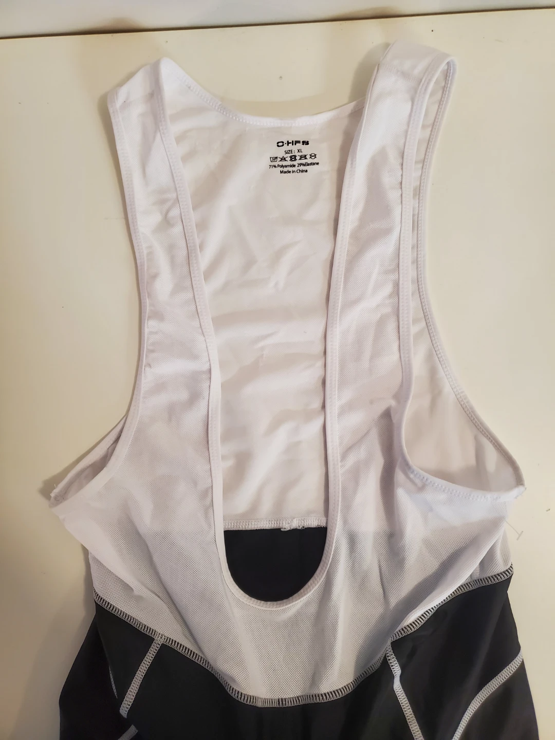 These black and white cycling bib shorts are made of stretchy material for comfort. They feature a 3D silicone padded insert for shock absorption. Breathable and designed for a snug fit.