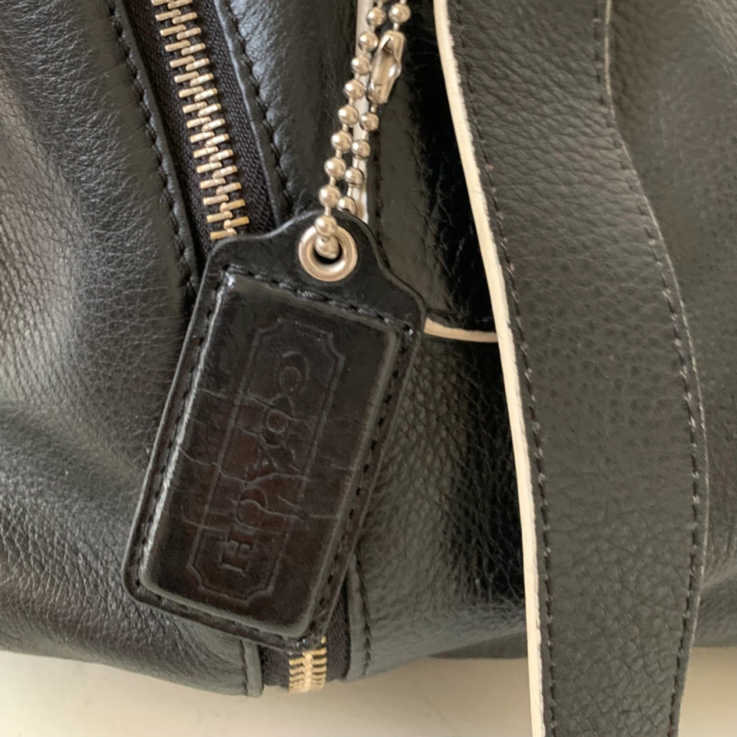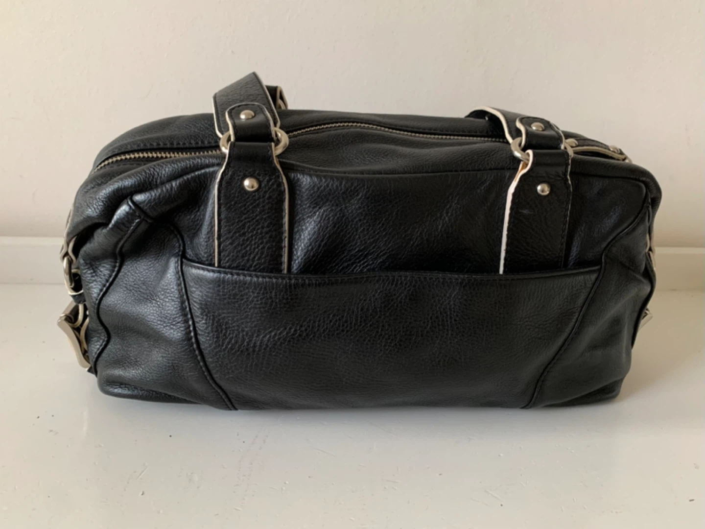 Selling a black leather satchel. It is in good condition. The bag has a zipper closure and multiple pockets inside. Perfect for everyday use!