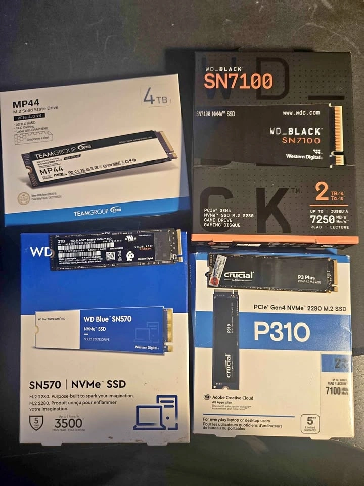 Buy & SellHigh end SSDs for SaleHigh end SSDs for Sale$150New: SN570 1TB - Sold SN7100 2TB - $350 MP44 4TB - $500 P310 2TB - $320 Used: SN850X 2TB - $300 P3 Plus - $250 Team Force 2TB Gen4 - $250WHERE TO MEETCheck LocationView MapSELLERmikanFinch556 reviews1 chats·1 favorites·65 viewsSEND CHAT TO SELLERHi mikan! I’m interested in your listing.Hi mikan! I’m interested in your listing.Get the Karrot app to chatSign In to chat
